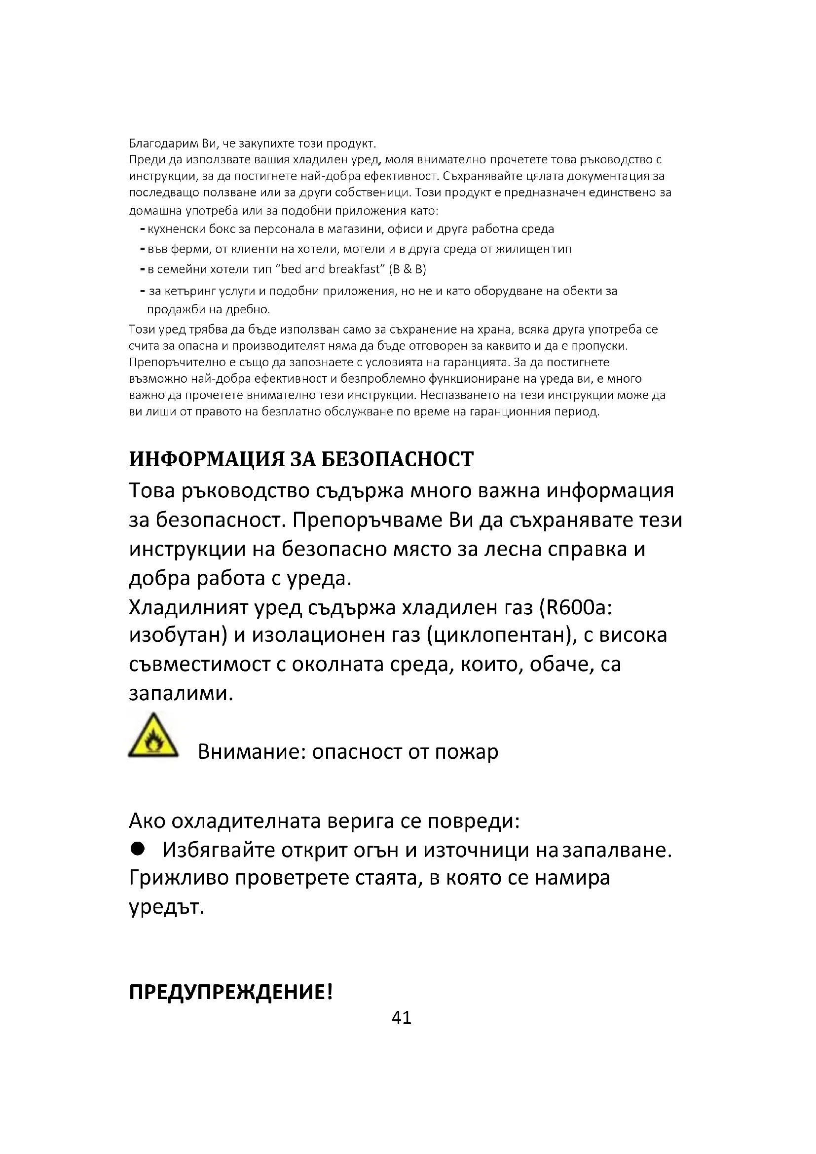 - ОТСТРАНЯВАНЕ НА НЕИЗПРАВНОСТИ Благодарим Ви, че закупихте този продукт. Преди да използвате вашия хладилен уред, моля внимателно прочетете това ръководство с инструкции, за да постигнете най-добра ефективност. Съхранявайте цялата документация за последващо ползване или за други собственици. Този продукт е предназначен единствено за домашна употреба или за подобни приложения като: - кухненски бокс за персонала в магазини, офиси и друга работна среда - във ферми, от клиенти на хотели, мотели и в друга среда от жилищен тип - в семейни хотели тип “bed and breakfast” (B & B) - за кетъринг услуги и подобни приложения, но не и като оборудване на обекти за продажби на дребно. Този уред трябва да бъде използван само за съхранение на храна, всяка друга употреба се счита за опасна и производителят няма да бъде отговорен за каквито и да е пропуски. Препоръчително е също да запознаете с условията на гаранцията. За да постигнете възможно най-добра ефективност и безпроблемно функциониране на уреда ви, е много важно да прочетете внимателно тези инструкции. Неспазването на тези инструкции може да ви лиши от правото на безплатно обслужване по време на гаранционния период. ИНФОРМАЦИЯ ЗА БЕЗОПАСНОСТ Това ръководство съдържа много важна информация за безопасност. Препоръчваме Ви да съхранявате тези инструкции на безопасно място за лесна справка и добра работа с уреда. Хладилният уред съдържа хладилен газ (R600a: изобутан) и изолационен газ (циклопентан), с висока съвместимост с околната среда, които, обаче, са p. 5741