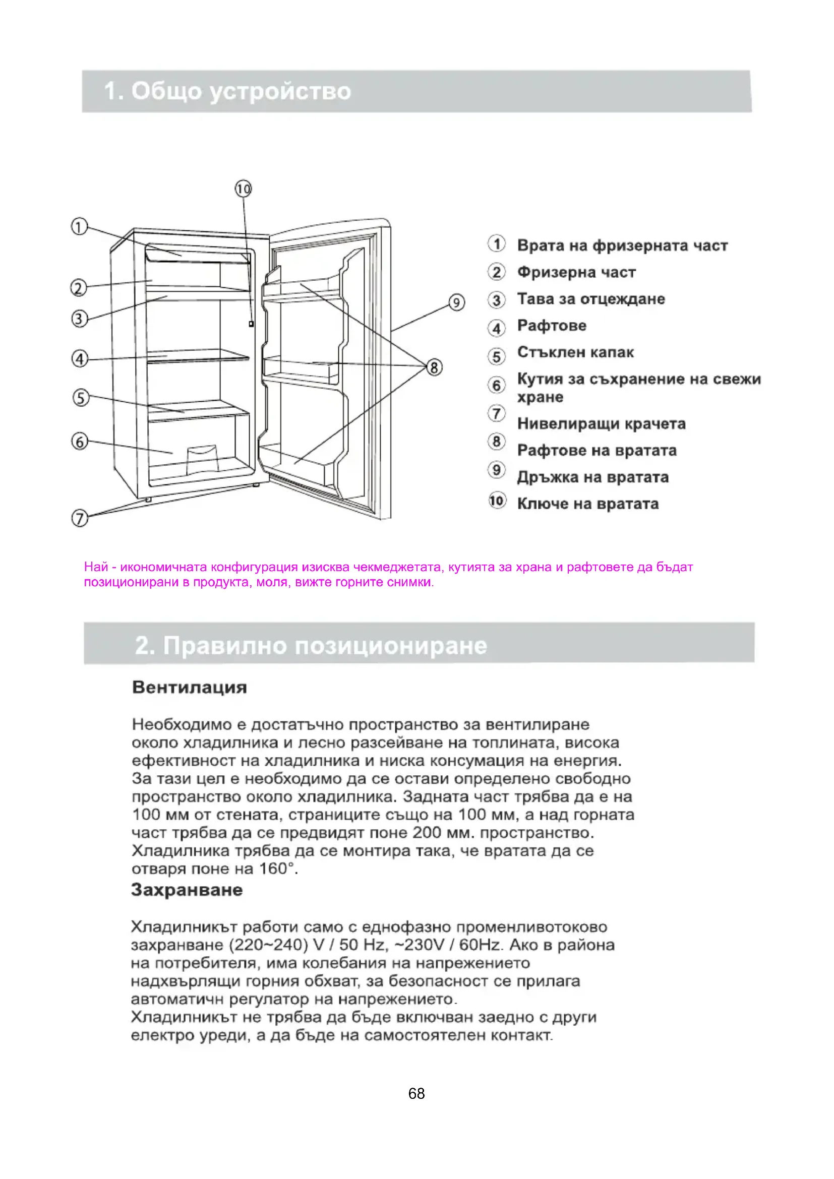 - за свободностоящ уред: „този хладилен уред не е предназначен за вграждане“;6768 Най - икономичната конфигурация изисква чекмеджетата, кутията за храна и рафтовете да бъдат позиционирани в продукта, моля, вижте горните снимки.Отделение на хладилника