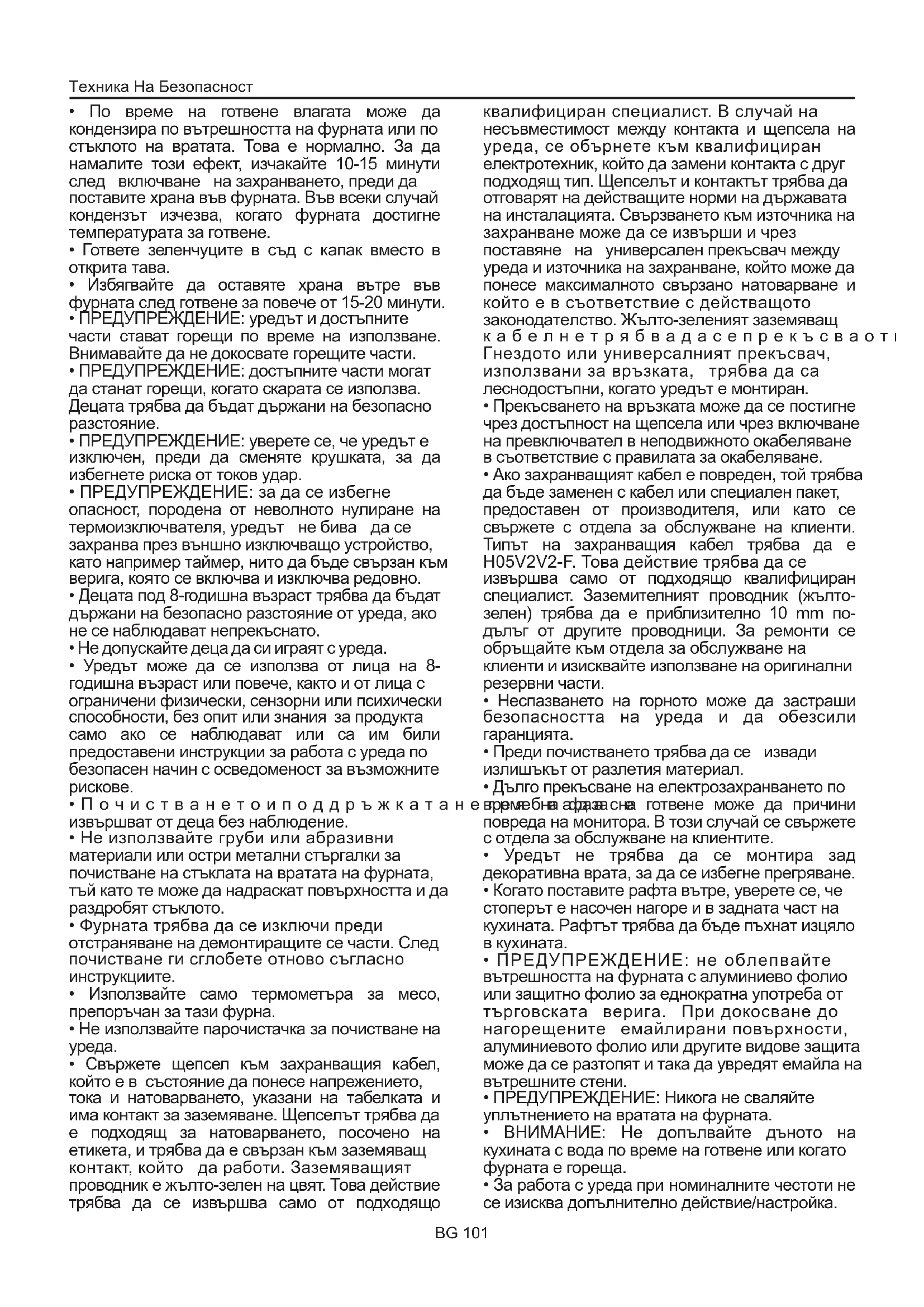 ЗАБЕЛЕЖКА Тъй като фурната може да се нуждае от поддръжка, препоръчително е да разполагате със свободно контактно гнездо в което да бъде включена, ако бъде преместена от мястото, на което е монтирана. Захранващият кабел трябва да се подменя единствено от електротехник, занимаващ се с поддръжка на електроуреди.