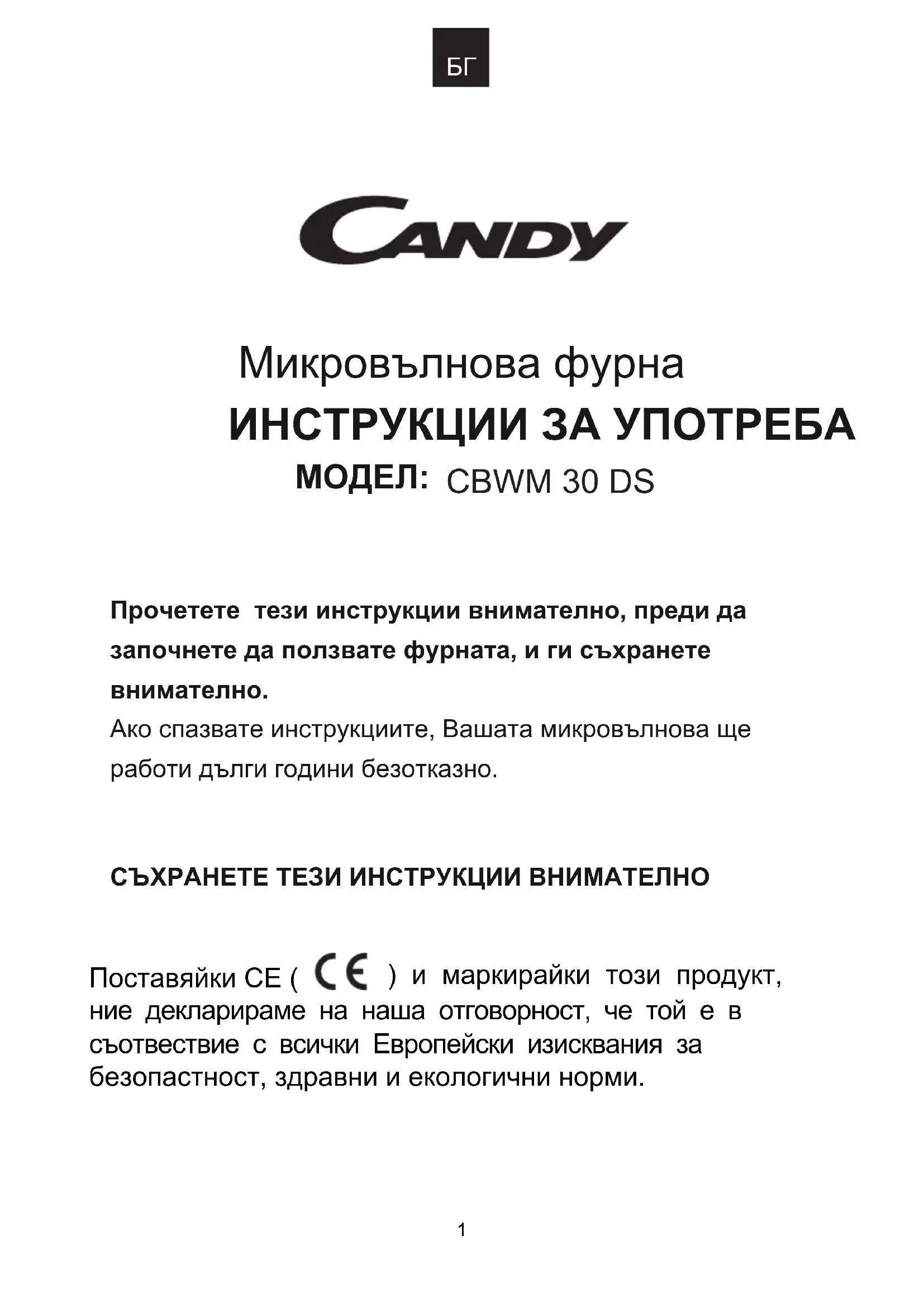 Прочетете тези инструкции внимателно, преди дазапочнете да ползвате фурната, и ги съхранетевнимателно.Ако спазвате инструкциите, Вашата микровълнова щеработи дълги години безотказно.СЪХРАНЕТЕ ТЕЗИ ИНСТРУКЦИИ ВНИМАТЕЛНО Поставяйки CE ( ) и маркирайки този продукт, ние декларираме на наша отговорност, че той е в съотвествие с всички Европейски изисквания за безопастност, здравни и екологични норми.