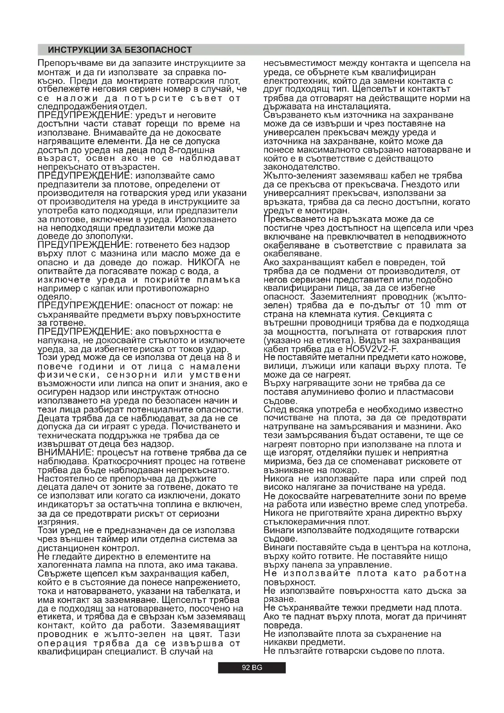 ПРЕДУПРЕЖДЕНИЕ: ако повърхността е напукана, не докосвайте стъклото и изключете уреда, за да избегнете риска от токов удар. Препоръчваме ви да запазите инструкциите за монтаж и да ги използвате за справка по- късно. Преди да монтирате готварския плот, отбележете неговия сериен номер в случай, че с е н а л о ж и д а п о т ъ р с и т е с ъ в е т о т следпродажбения отдел. Този уред не е предназначен да се използва чрез външен таймер или отделна система за дистанционен контрол. Свържете щепсел към захранващия кабел, който е в състояние да понесе напрежението, тока и натоварването, указани на табелката, и има контакт за заземяване. Щепселът трябва да е подходящ за натоварването, посочено на етикета, и трябва да е свързан към заземяващ контакт, който да работи. Заземяващият проводник е жълто-зелен на цвят. Тази операция трябва да се извършва от квалифициран специалист. В случай на ИНСТРУКЦИИЗАБЕЗОПАСНОСТ 92 BG Свързването към източника на захранване може да се извърши и чрез поставяне на универсален прекъсвач между уреда и източника на захранване, който може да понесе максималното свързано натоварване и който е в съответствие с действащото законодателство. Върху нагряващите зони не трябва да се поставя алуминиево фолио и пластмасови