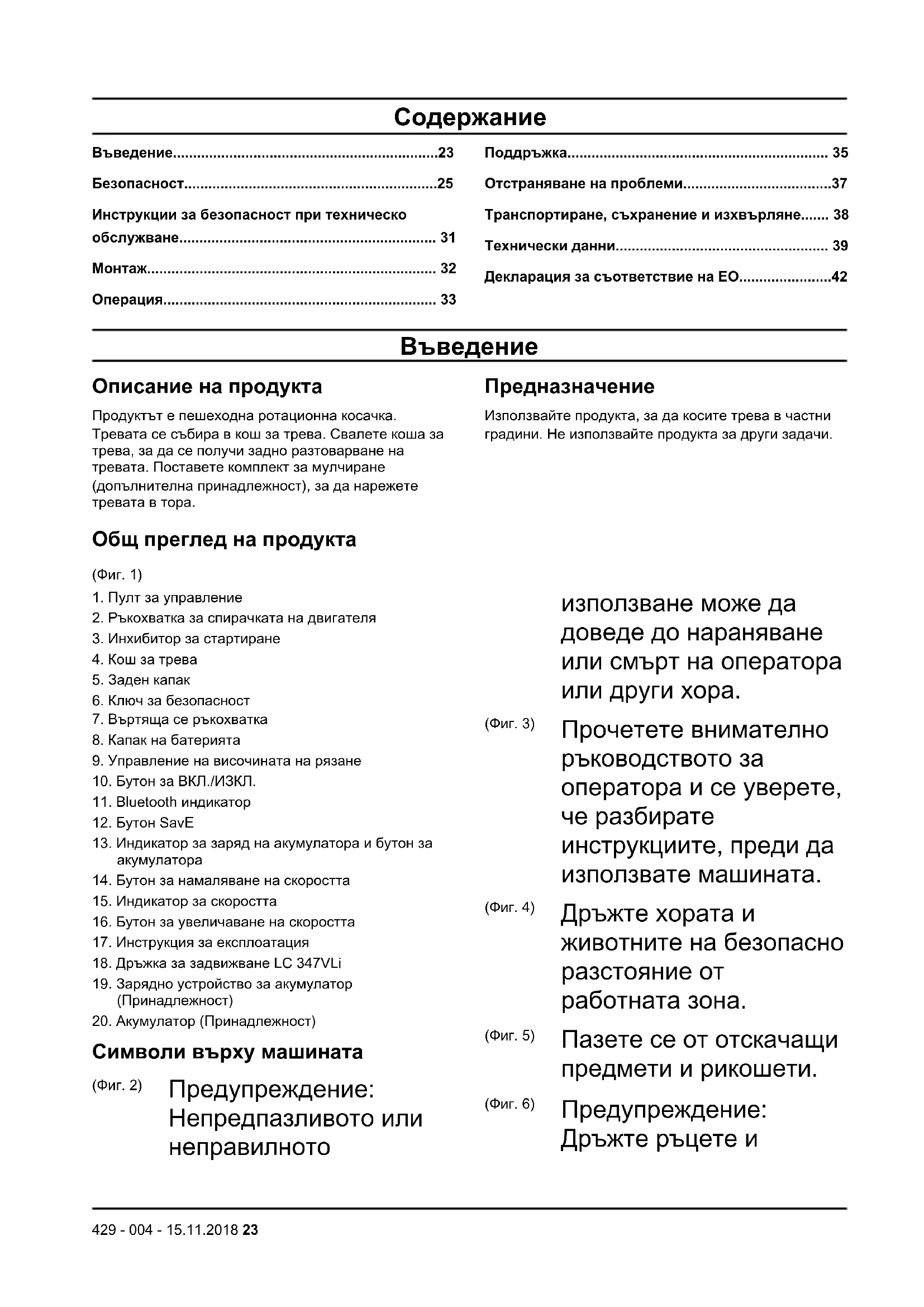 Описание на продукта Продуктът е пешеходна ротационна косачка. Тревата се събира в кош за трева. Свалете коша за трева, за да се получи задно разтоварване на тревата. Поставете комплект за мулчиране (допълнителна принадлежност), за да нарежете тревата в тора. Предназначение Използвайте продукта, за да косите трева в частни градини. Не използвайте продукта за други задачи. Общ преглед на продукта (Фиг. 1)