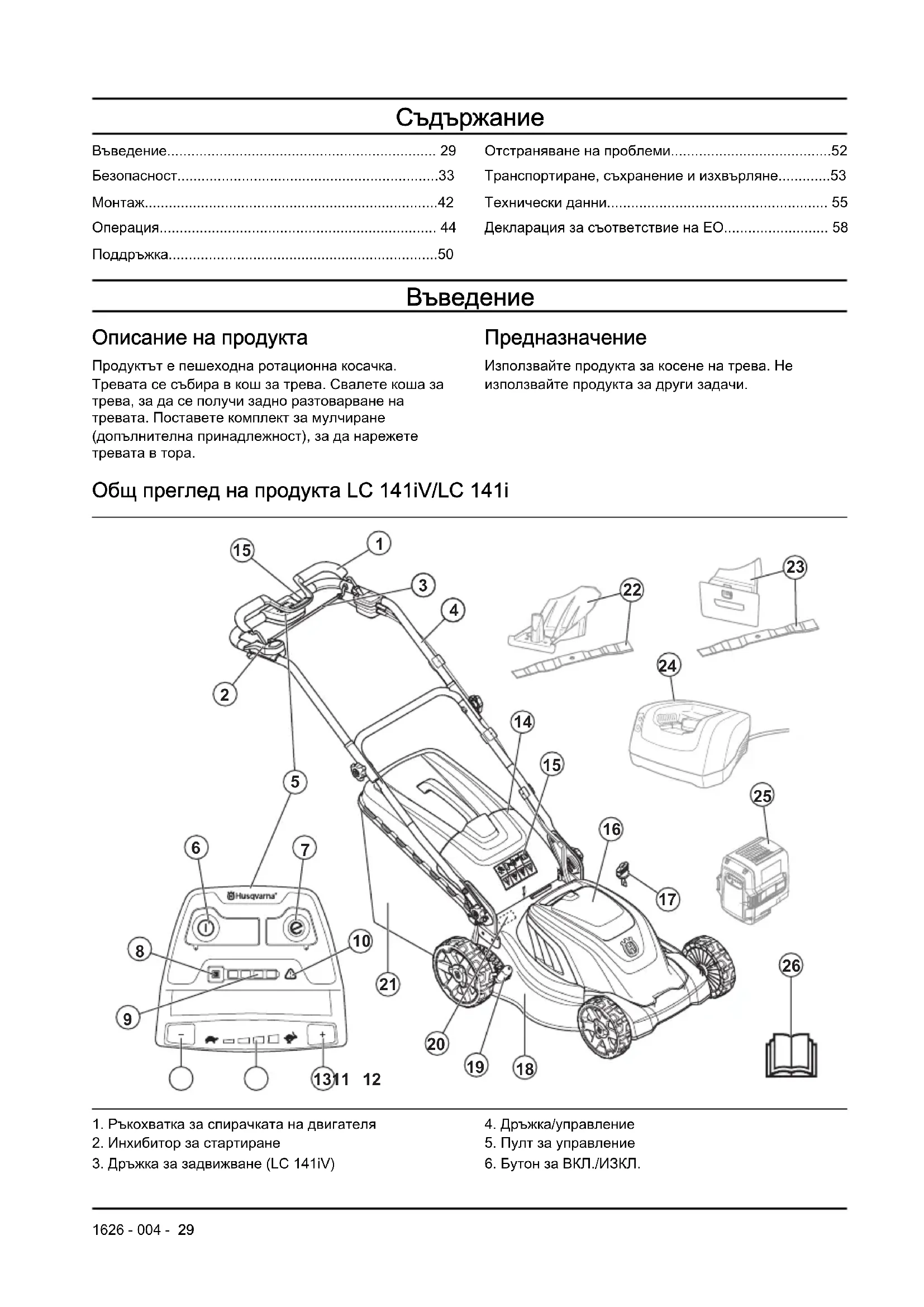 Описание на продукта Продуктът е пешеходна ротационна косачка. Тревата се събира в кош за трева. Свалете коша за трева, за да се получи задно разтоварване на тревата. Поставете комплект за мулчиране (допълнителна принадлежност), за да нарежете тревата в тора. Предназначение Използвайте продукта за косене на трева. Не използвайте продукта за други задачи. Общ преглед на продукта LC 141iV/LC 141i