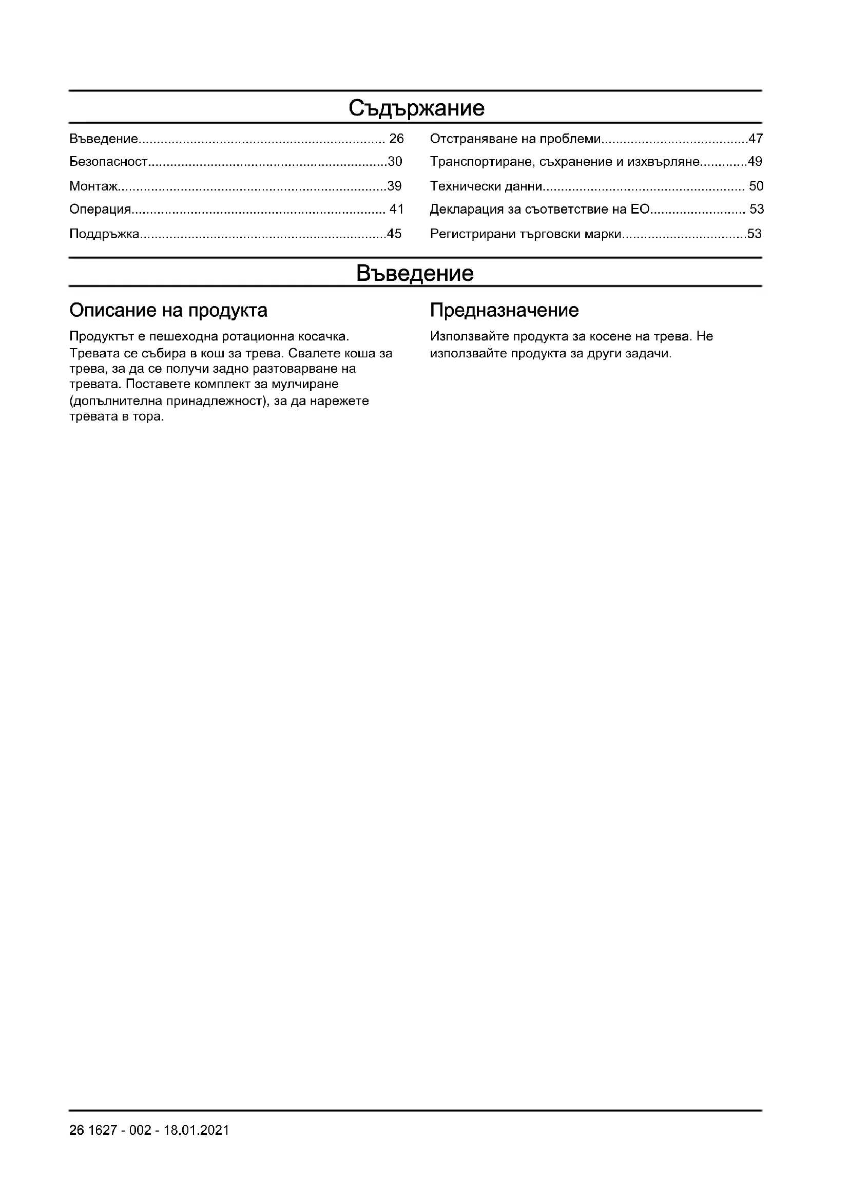 Описание на продукта Продуктът е пешеходна ротационна косачка. Тревата се събира в кош за трева. Свалете коша за трева, за да се получи задно разтоварване на тревата. Поставете комплект за мулчиране (допълнителна принадлежност), за да нарежете тревата в тора. Предназначение Използвайте продукта за косене на трева. Не използвайте продукта за други задачи. 26 1627 - 002 - 18.01.2021Общ преглед на продукта