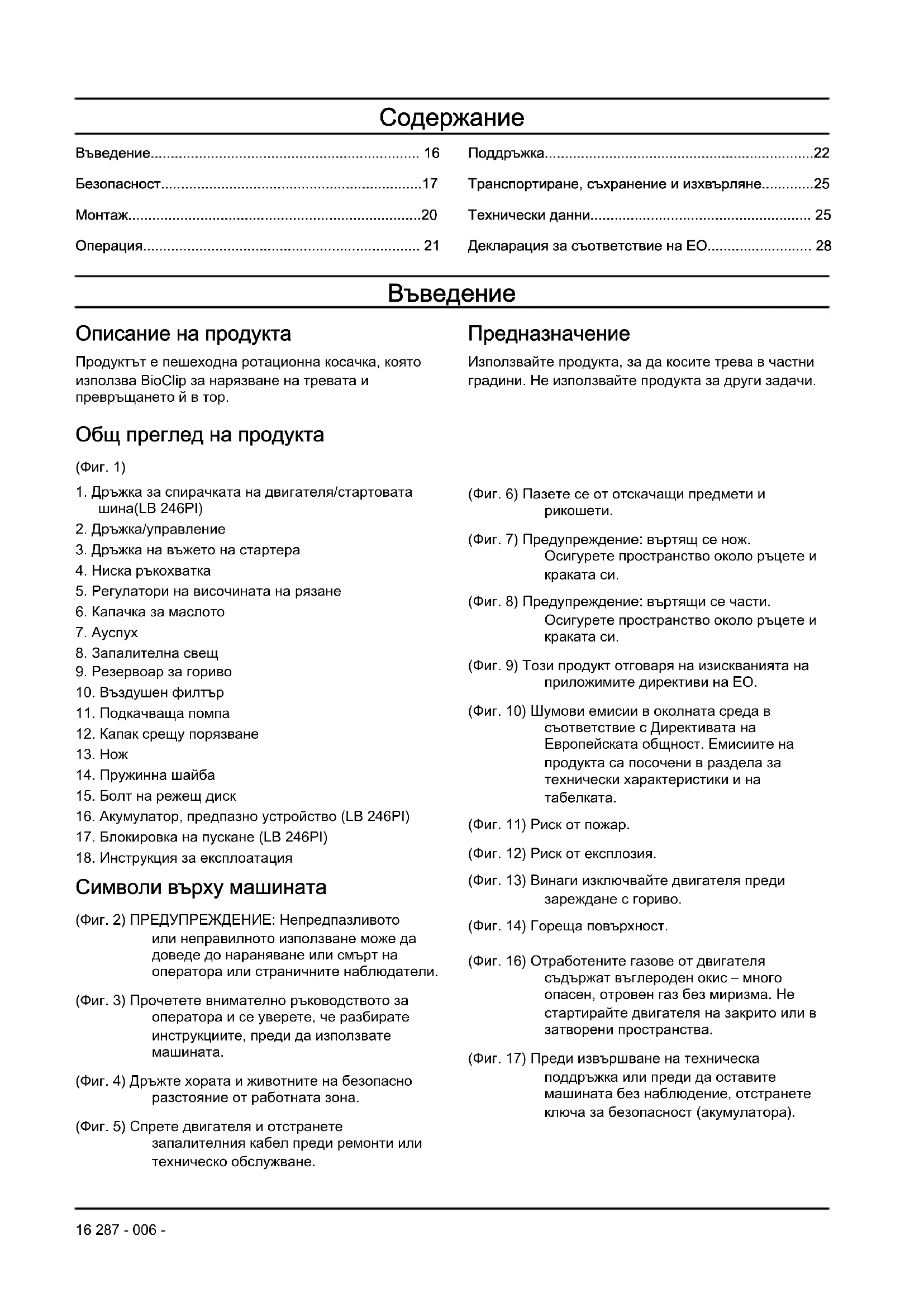 (Фиг. 11) Риск от пожар. (Фиг. 12) Риск от експлозия. (Фиг. 13) Винаги изключвайте двигателя преди зареждане с гориво. (Фиг. 14) Гореща повърхност. (Фиг. 16) Отработените газове от двигателя съдържат въглероден окис – много опасен, отровен газ без миризма. Не стартирайте двигателя на закрито или в затворени пространства. (Фиг. 17) Преди извършване на техническа поддръжка или преди да оставите машината без наблюдение, отстранете ключа за безопасност (акумулатора). 16 287 - 006 -(Фиг. 18) Процедура за пускане на LB 146P: Натиснете дръжката на спирачката на двигателя надолу и дръпнете дръжката на стартерното въже. (Фиг. 19) Процедура за пускане на LB 246PI: Освободете блокировката за пускане и натиснете надолу стартовата шина. (Фиг. 15) Код с възможност за сканиране. Забележка: Останалите символи/лепенки на продукта се отнасят до изисквания по отношение на сертификати за други търговски зони. Емисии Euro V ПРЕДУПРЕЖДЕНИЕ: Намесата в двигателя прави невалидно ЕС одобрението на тип на този продукт. Отговорност за продукта Както е посочено в законите за отговорност за вреди, причинени от стоки, ние не носим отговорност за щети, причинени от нашия продукт, ако: