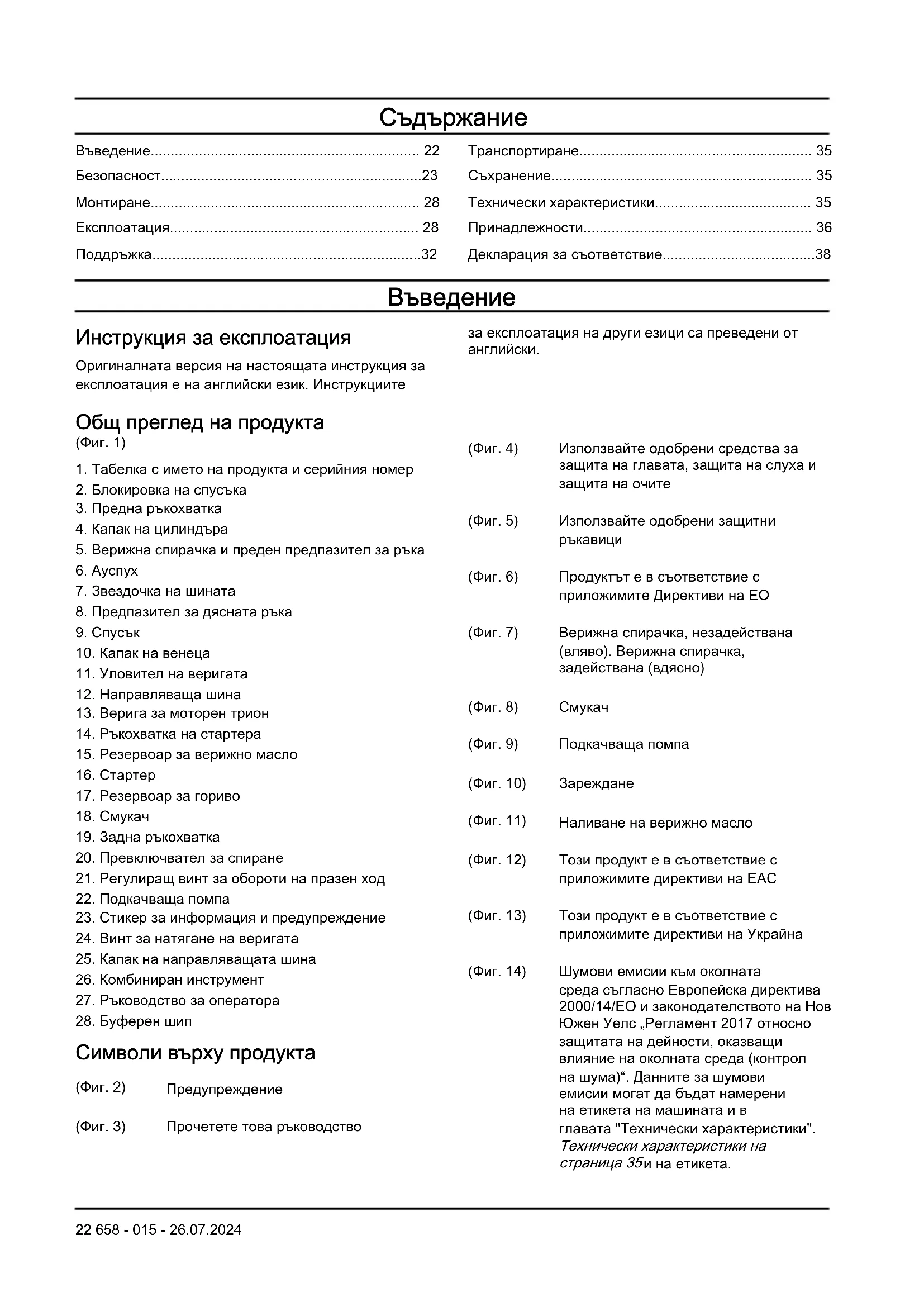 (Фиг. 11) Наливане на верижно масло (Фиг. 12) Този продукт е в съответствие с приложимите директиви на EAC (Фиг. 13) Този продукт е в съответствие с приложимите директиви на Украйна (Фиг. 14) Шумови емисии към околната среда съгласно Европейска директива 2000/14/ЕО и законодателството на Нов Южен Уелс „Регламент 2017 относно защитата на дейности, оказващи влияние на околната среда (контрол на шума)“. Данните за шумови емисии могат да бъдат намерени на етикета на машината и в главата "Технически характеристики". Технически характеристики на страница 35 и на етикета. 22 658 - 015 - 26.07.2024(Фиг. 15) Дръжте продукта правилно с две ръце (Фиг. 16) Не използвайте с една ръка (Фиг. 17) Избягвайте контакт с върха на направляващата шина (Фиг. 18) Пазете се от откат (Фиг. 19) Този продукт е в съответствие с приложимите директиви на Австралия и Нова Зеландия относно електромагнитната съвместимост. Забележка: Останалите символи/стикери на продукта се отнасят до изисквания по отношение на сертификати за други търговски площи. Отговорност за продукта Както е посочено в законите за отговорност за вреди, причинени от стоки, ние не носим отговорност за щети, причинени от нашия продукт,