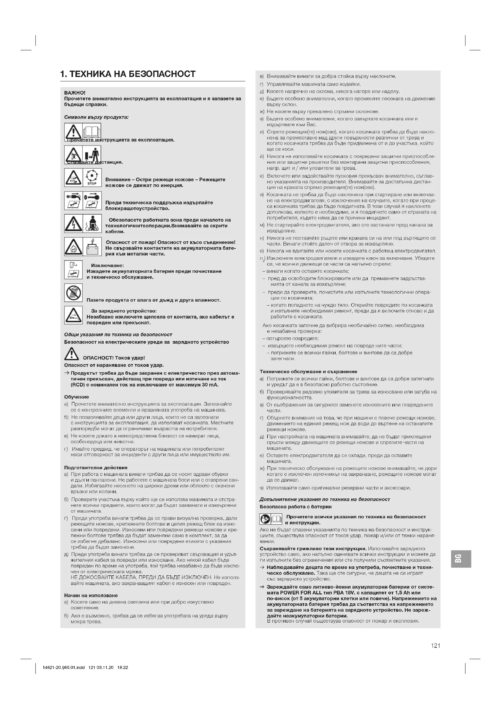 ж) При техническо обслужване на режещите ножове внимавайте, че дори когато е изключен източникът на захранване, режещите ножове могат да се движат. з) Използвайте само оригинални резервни части и аксесоари. Допълнителни указания по техника на безопасност Безопасна работа с батерии Прочетете всички указания по техника на безопасност иинструкции. Ако не бъдат спазени указанията по техника на безопасност и инструк- циите, съществува опасност от токов удар, пожар и/или от тежки нараня-