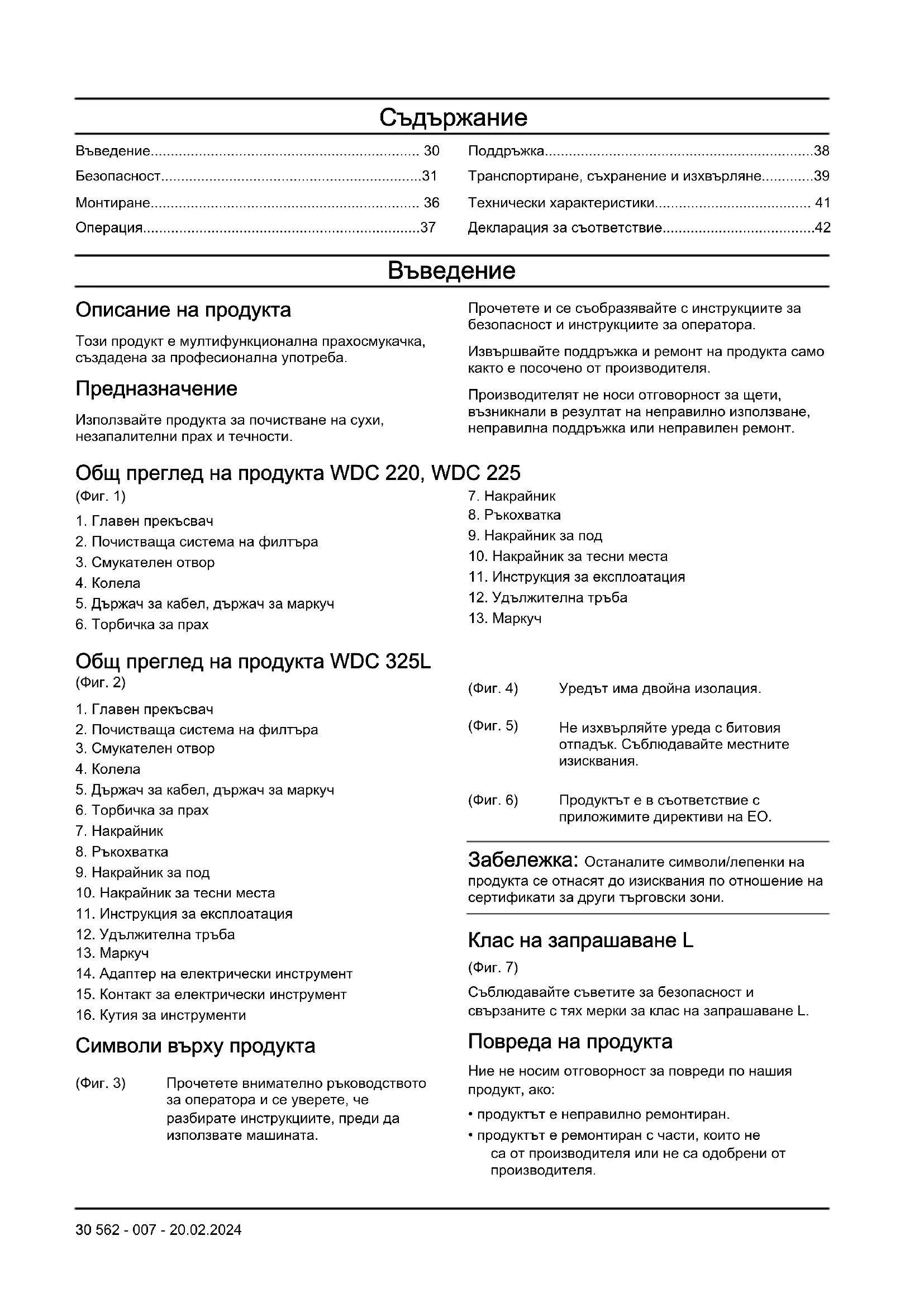За продукти от клас на запрашаване L, WDC 325L, преди ползване запознайте и обучете оператора: