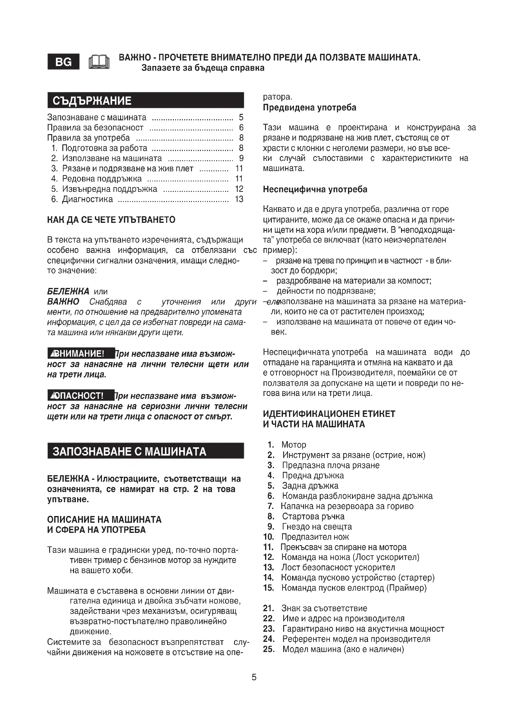 Предвидена употреба Тази машина е проектирана и конструирана за рязане и подрязване на жив плет, състоящ се от храсти с клонки с неголеми размери, но във все- ки случай съпоставими с характеристиките на