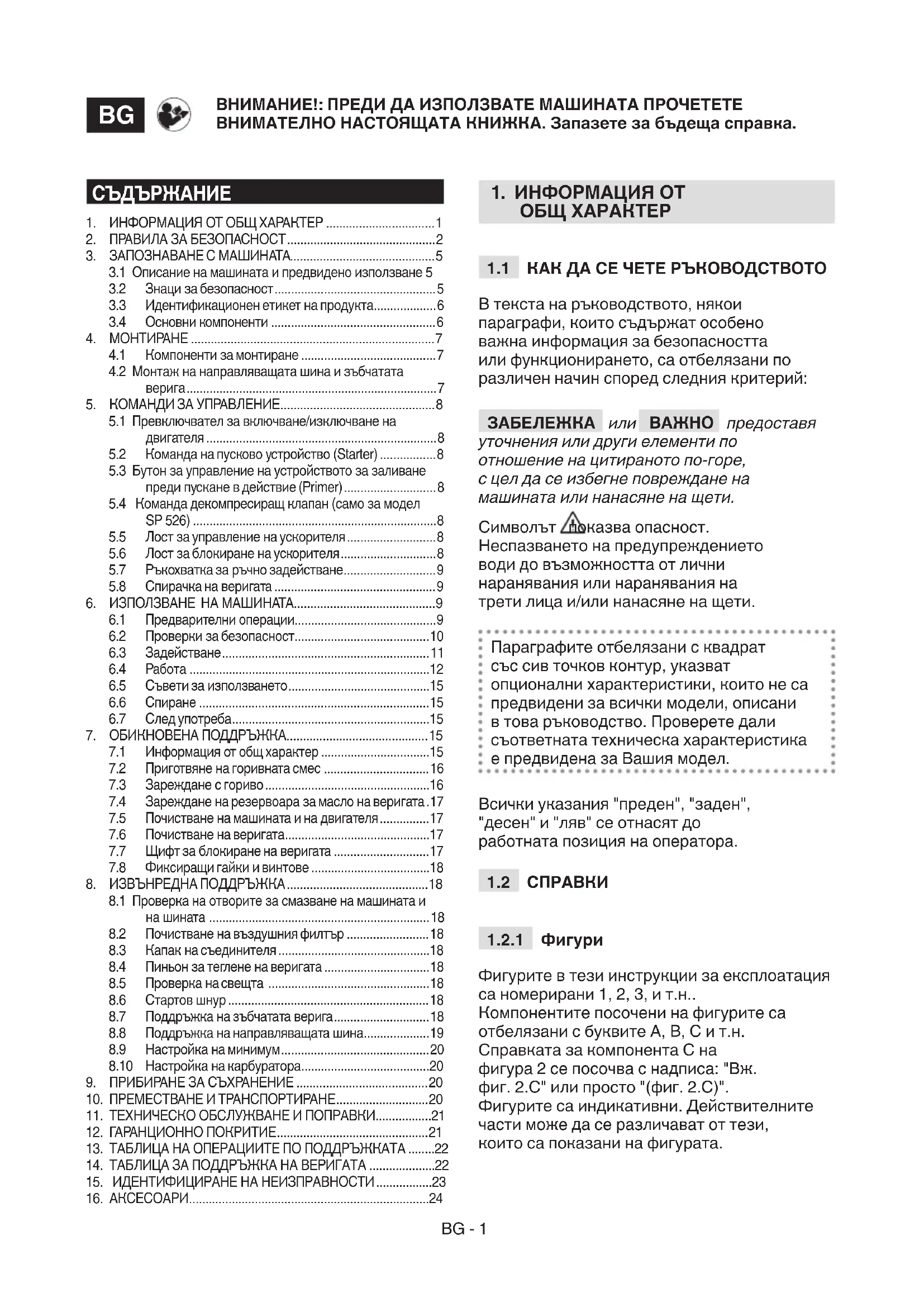 Фигурите в тези инструкции за експлоатация са номерирани 1, 2, 3, и т.н.. Компонентите посочени на фигурите са отбелязани с буквите A, B, C и т.н. Справката за компонента C на фигура 2 се посочва с надписа: "Вж. фиг. 2.C" или просто "(фиг. 2.C)". Фигурите са индикативни. Действителните части може да се различават от тези, които са показани на фигурата. ВНИМАНИЕ!: ПРЕДИ ДА ИЗПОЛЗВАТЕ МАШИНАТА ПРОЧЕТЕТЕ ВНИМАТЕЛНО НАСТОЯЩАТА КНИЖКА. Запазете за бъдеща справка.