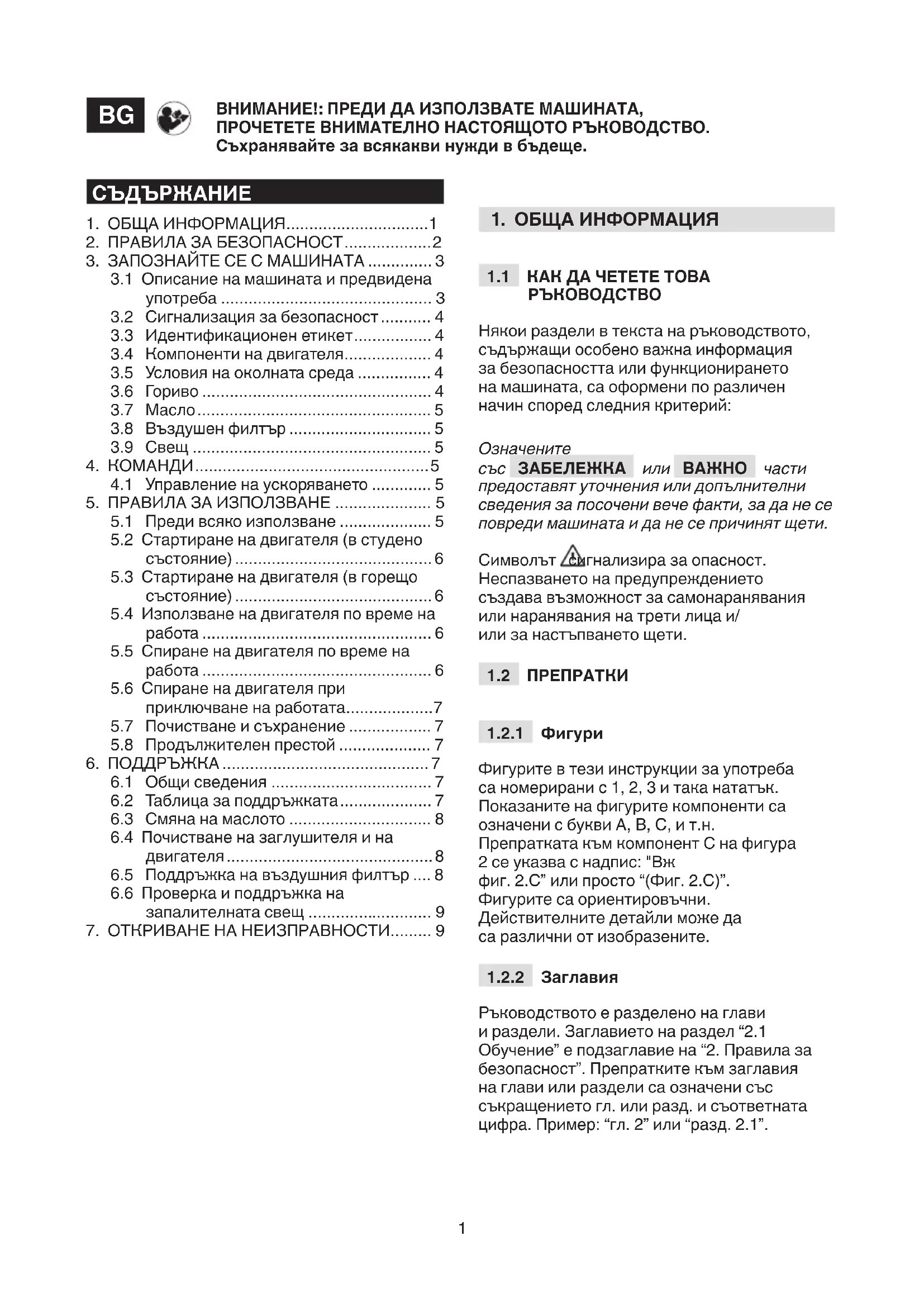 Ръководството е разделено на глави и раздели. Заглавието на раздел “2.1 Обучение” е подзаглавие на “2. Правила за безопасност”. Препратките към заглавия на глави или раздели са означени със съкращението гл. или разд. и съответната цифра. Пример: “гл. 2” или “разд. 2.1”. ВНИМАНИЕ!: ПРЕДИ ДА ИЗПОЛЗВАТЕ МАШИНАТА, ПРОЧЕТЕТЕ ВНИМАТЕЛНО НАСТОЯЩОТО РЪКОВОДСТВО. Съхранявайте за всякакви нужди в бъдеще.