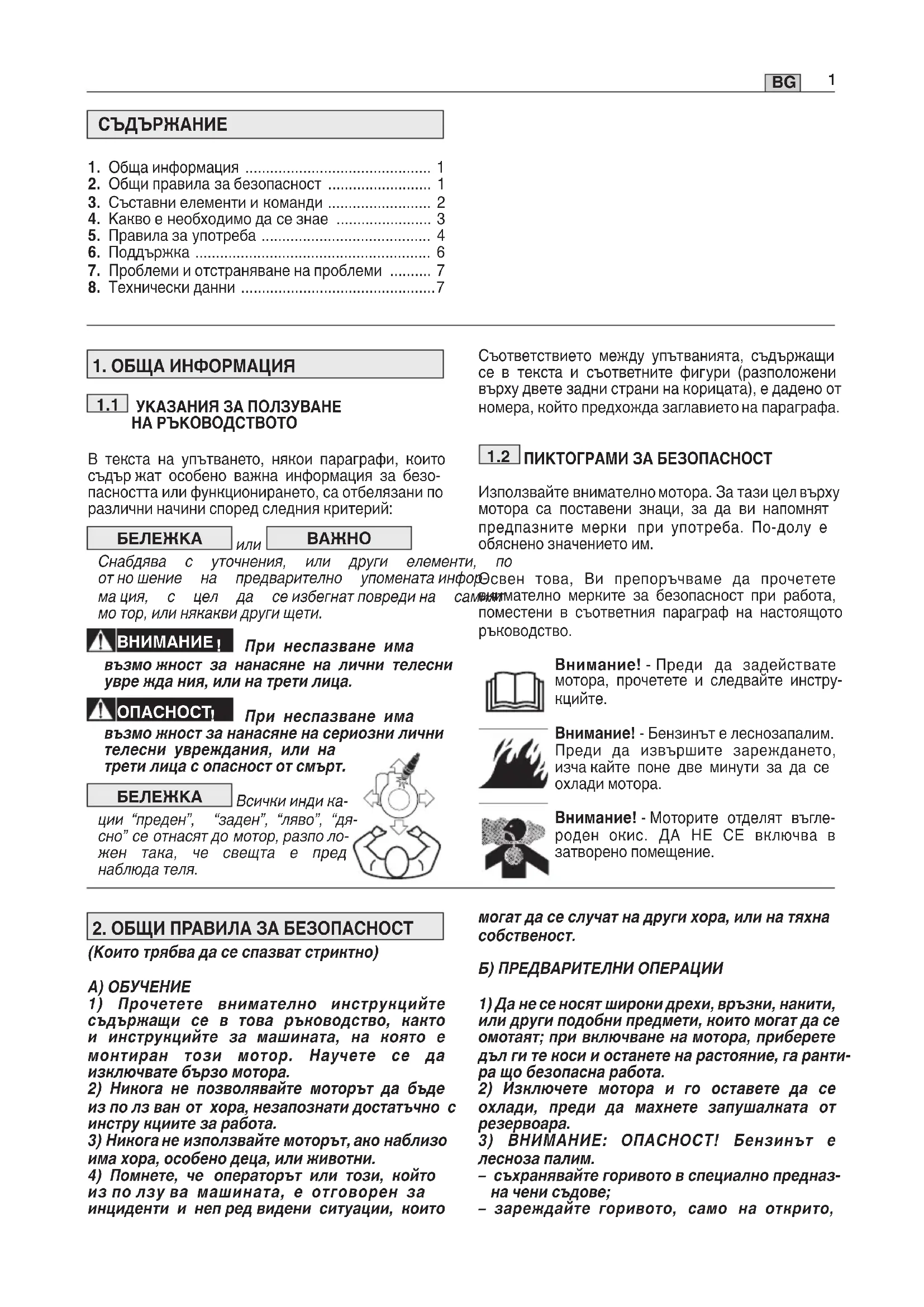ПИKТОГРАМИ ЗА БЕЗОПАСНОСТ Използвайте внимателно мотора. За тази цел върху мотора са поставени знаци, за да ви напомнят предпазните мерки при употреба. По-долу е обяснено значението им. Освен това, Ви препоръчваме да прочетете внимателно мерките за безопасност при работа, поместени в съответния параграф на настоящото ръководство. Внимание! - Преди да задействате мотора, прочетете и следвайте инстру-