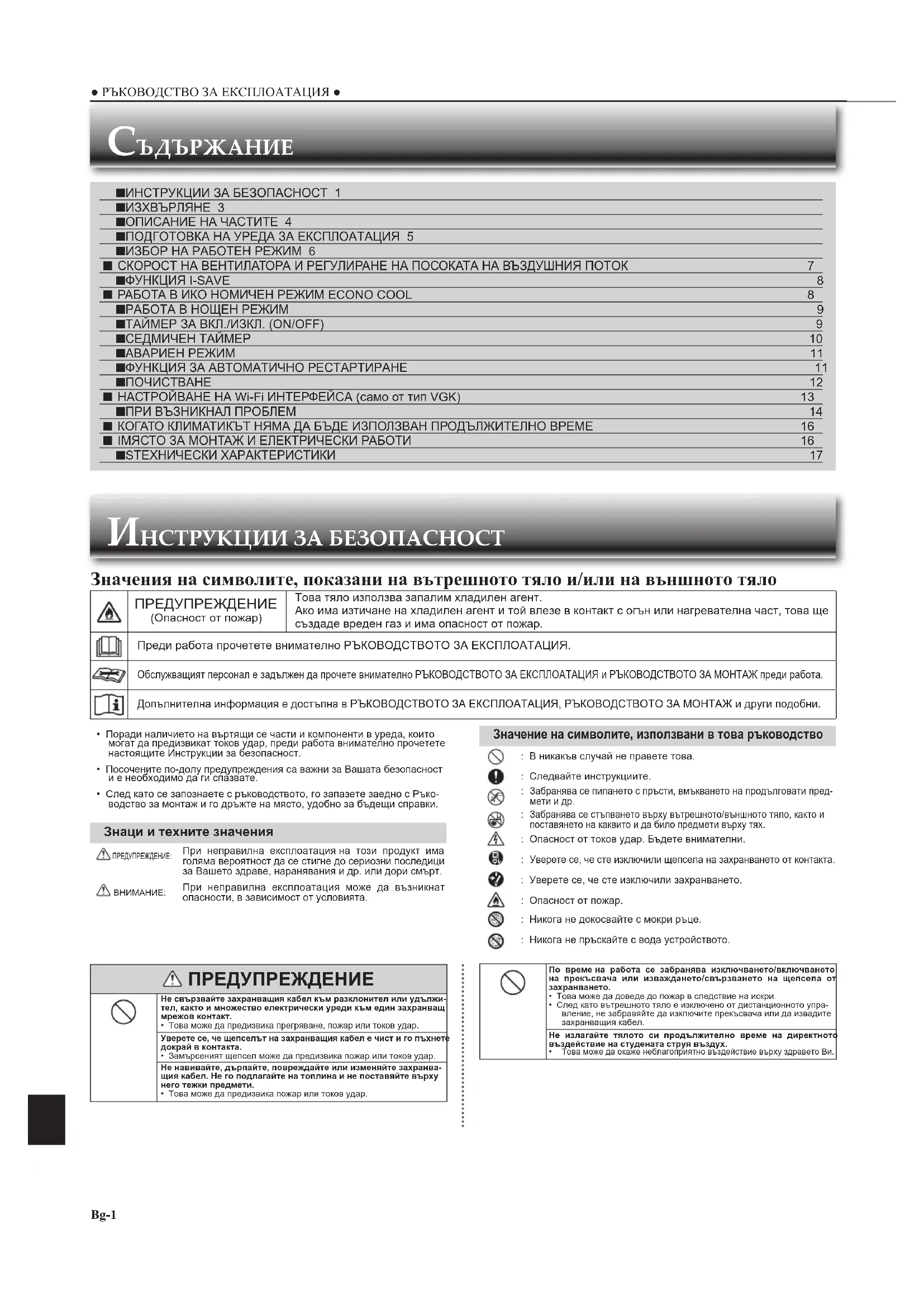 ПРЕДУПРЕЖДЕНИЕ Не свързвайте захранващия кабел към разклонител или удължи-тел, както и множество електрически уреди към един захранващ мрежов контакт.• Това може да предизвика прегряване, пожар или токов удар.Уверете се, че щепселът на захранващия кабел е чист и го пъхнете докрай в контакта.• Замърсеният щепсел може да предизвика пожар или токов удар.Не навивайте, дърпайте, повреждайте или изменяйте захранва-щия кабел. Не го подлагайте на топлина и не поставяйте върху него тежки предмети.• Това може да предизвика пожар или токов удар.• Поради наличието на въртящи се части и компоненти в уреда, които могат да предизвикат токов удар, преди работа внимателно прочетете настоящите Инструкции за безопасност.• Посочените по-долу предупреждения са важни за Вашата безопасност и е необходимо да ги спазвате.• След като се запознаете с ръководството, го запазете заедно с Ръко-водство за монтаж и го дръжте на място, удобно за бъдещи справки. Знаци и техните значения ПРЕДУПРЕЖДЕНИЕ:При неправилна експлоатация на този продукт има голяма вероятност да се стигне до сериозни последици за Вашето здраве, наранявания и др. или дори смърт. ВНИМАНИЕ:При неправилна експлоатация може да възникнат опасности, в зависимост от условията.По време на работа се забранява изключването/включването на прекъсвача или изваждането/свързването на щепсела от захранването.• Това може да доведе до пожар в следствие на искри.• След като вътрешното тяло е изключено от дистанционното упра-вление, не забравяйте да изключите прекъсвача или да извадите захранващия кабел. Не излагайте тялото си продължително време на директното въздействие на студената струя въздух. Това може да окаже неблагоприятно въздействие върху здравето Ви. Значение на символите, използвани в това ръководство : В никакъв случай не правете това. : Следвайте инструкциите. Забранява се пипането с пръсти, вмъкването на продълговати пред-мети и др. Забранява се стъпването върху вътрешното/външното тяло, както и поставянето на каквито и да било предмети върху тях. : Опасност от токов удар. Бъдете внимателни. Уверете се, че сте изключили щепсела на захранването от контакта. : Уверете се, че сте изключили захранването. : Опасност от пожар. : Никога не докосвайте с мокри ръце. : Никога не пръскайте с вода устройството. ИНСТРУКЦИИ ЗА БЕЗОПАСНОСТ Значения на символите, показани на вътрешното тяло и/или на външното тяло ПРЕДУПРЕЖДЕНИЕ (Опасност от пожар)Това тяло използва запалим хладилен агент.Ако има изтичане на хладилен агент и той влезе в контакт с огън или нагревателна част, това ще създаде вреден газ и има опасност от пожар.Преди работа прочетете внимателно РЪКОВОДСТВОТО ЗА ЕКСПЛОАТАЦИЯ. Обслужващият персонал е задължен да прочете внимателно РЪКОВОДСТВОТО ЗА ЕКСПЛОАТАЦИЯ и РЪКОВОДСТВОТО ЗА МОНТАЖ преди работа. Допълнителна информация е достъпна в РЪКОВОДСТВОТО ЗА ЕКСПЛОАТАЦИЯ, РЪКОВОДСТВОТО ЗА МОНТАЖ и други подобни. ■ ИНСТРУКЦИИ ЗА БЕЗОПАСНОСТ 1 ■ ИЗХВЪРЛЯНЕ 3 ■ ОПИСАНИЕ НА ЧАСТИТЕ 4 ■ ПОДГОТОВКА НА УРЕДА ЗА ЕКСПЛОАТАЦИЯ 5 ■ ИЗБОР НА РАБОТЕН РЕЖИМ 6 ■ СКОРОСТ НА ВЕНТИЛАТОРА И РЕГУЛИРАНЕ НА ПОСОКАТА НА ВЪЗДУШНИЯ ПОТОК 7 ■ ФУНКЦИЯ I-SAVE 8 ■ РАБОТА В ИКО НОМИЧЕН РЕЖИМ ECONO COOL 8 ■ РАБОТА В НОЩЕН РЕЖИМ 9 ■ ТАЙМЕР ЗА ВКЛ./ИЗКЛ. (ON/OFF) 9 ■ СЕДМИЧЕН ТАЙМЕР 10 ■ АВАРИЕН РЕЖИМ 11 ■ ФУНКЦИЯ ЗА АВТОМАТИЧНО РЕСТАРТИРАН