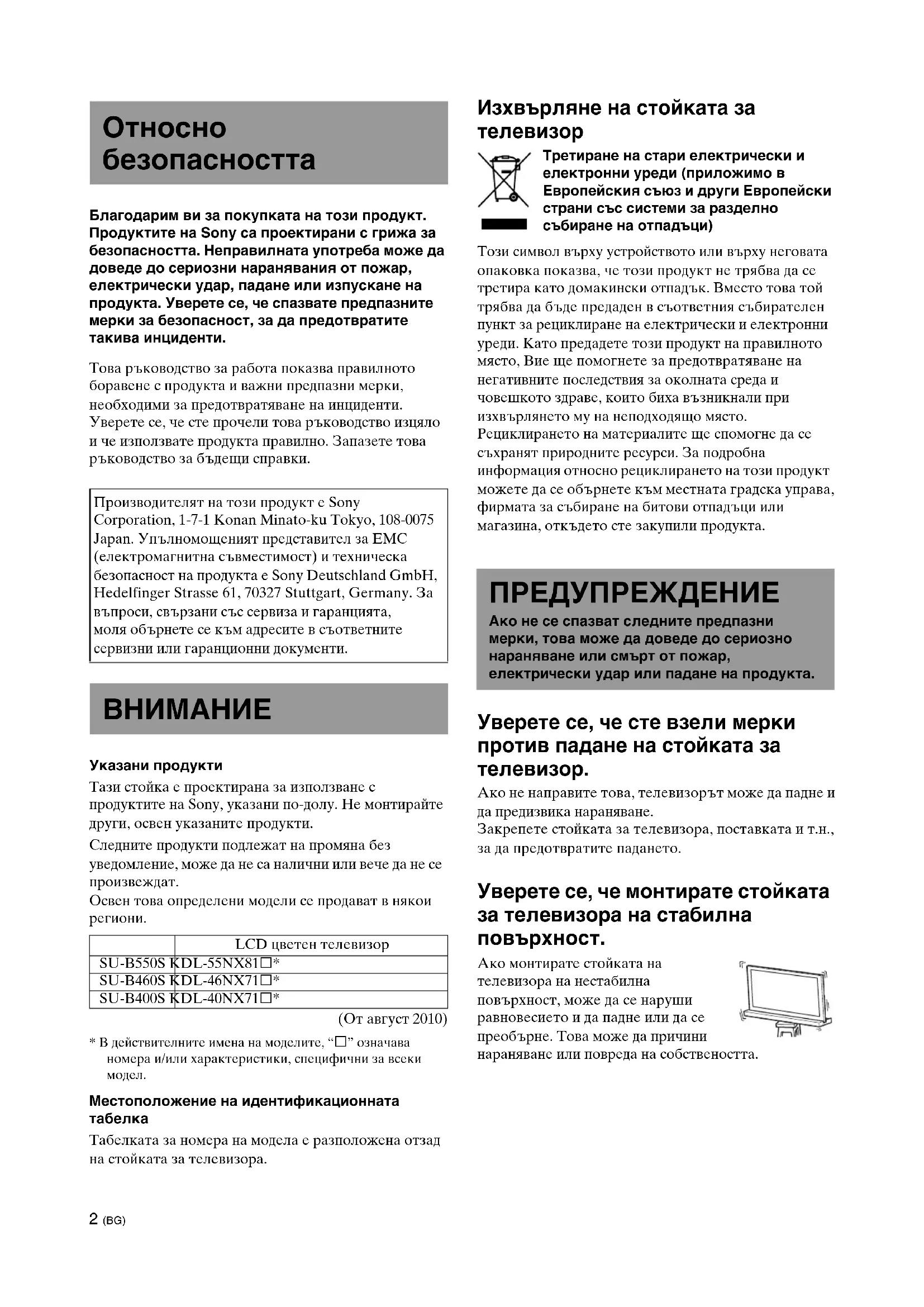 LCD цветен телевизор SU-B550S KDL-55NX81s* SU-B460S KDL-46NX71s* SU-B400S KDL-40NX71s* ПРЕДУПРЕЖДЕНИЕ Ако не се спазват следните предпазни мерки, това може да доведе до сериозно нараняване или смърт от пожар, електрически удар или падане на продукта.3 (BG) Не се навеждайте и не увисвайте от телевизора, когато телевизорът е поставен на стойката за телевизора. Стойката за телевизора може да се преобърне, или телевизора да падне и да причини сериозно нараняване или