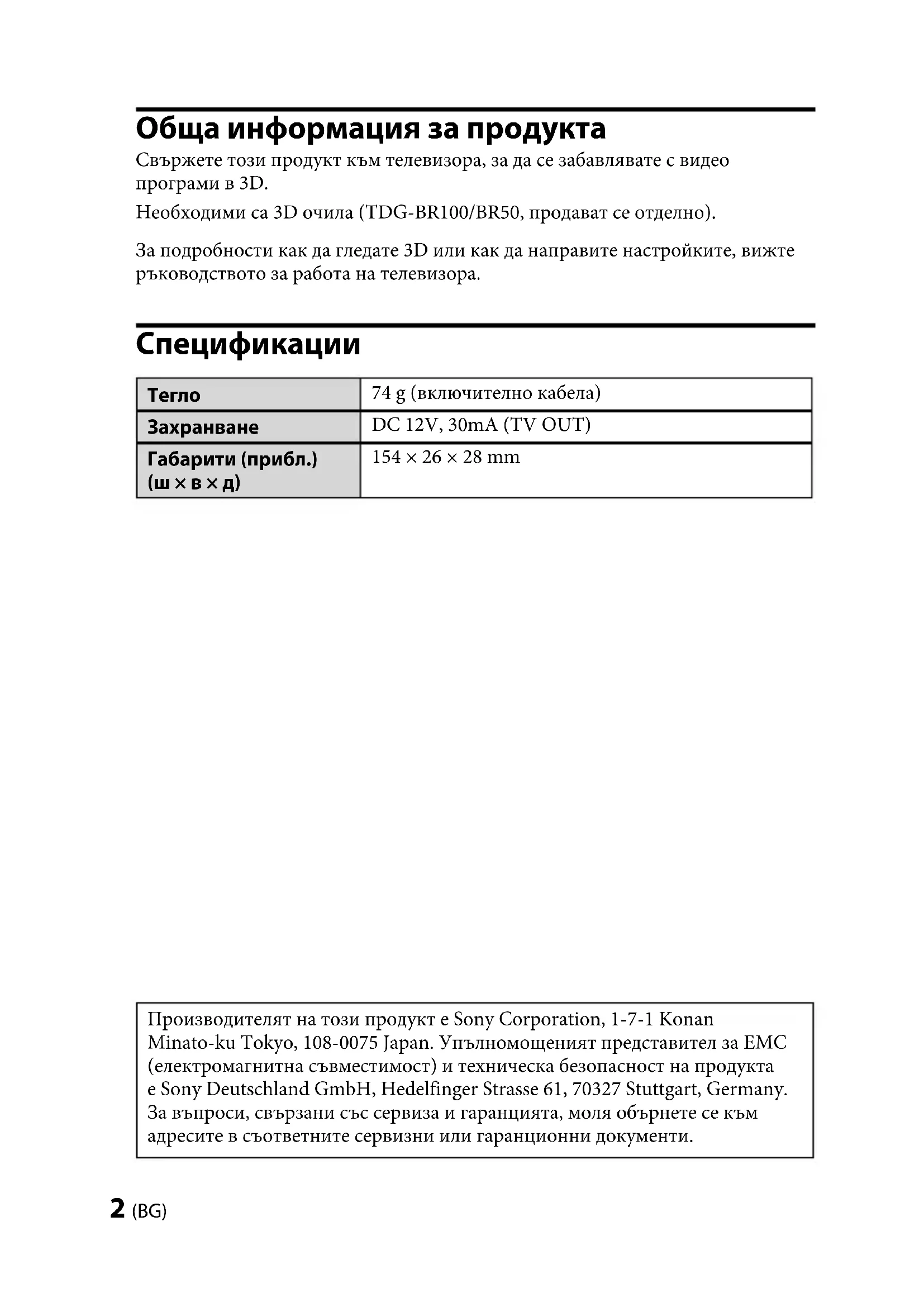 DC 12V, 30mA (TV OUT) Габарити (прибл.) (ш × в × д) 154 × 26 × 28 mm Производителят на този продукт е Sony Corporation, 1-7-1 Konan Minato-ku Tokyo, 108-0075 Japan. Упълномощеният представител за EMC (електромагнитна съвместимост) и техническа безопасност на продукта е Sony Deutschland GmbH, Hedelfinger Strasse 61, 70327 Stuttgart, Germany. За въпроси, свързани със сервиза и гаранцията, моля обърнете се към адресите в съответните сервизни или гаранционни документи.TMR-BR100 4-180-471-26(1) TMR-BR100 4-180-471-26(1) 3 (BG) Изхвърляне на 3D синхронен предавател Третиране на стари електрически и електронни уреди (приложимо в Европейския съюз и други Европейски страни със системи за разделно събиране на отпадъци) Този символ върху устройството или върху неговата опаковка показва, че този продукт не трябва да се третира като домакински отпадък. Вместо това той трябва да бъде предаден в съответния събирателен пункт за рециклиране на електрически и електронни уреди. Като предадете този продукт на правилното място, Вие ще помогнете за предотвратяване на негативните последствия за околната среда и човешкото здраве, които биха възникнали при изхвърлянето му на неподходящо място. Рециклирането на материалите ще спомогне да се съхранят природните ресурси. За подробна информация относно рециклирането на този продукт можете да се обърнете към местната градска управа, фирмата за събиране на битови отпадъци или магазина, откъдето сте закупили продукта. BGTMR-BR100 4-180-471-26(1) 4 (BG) TMR-BR100 4-180-471-26(1) Предупреждение Прочетете внимателно тези инструкции за безопасност, за да осигурите личната си безопасност и да предотвратите повреда на имущество. Предпазни мерки при употреба 3D очилата получават инфрачервени лъчи от 3D синхронен предавател. Ако наблизо има други източници на инфрачервена комуникация, осветление, парно отопление и др., това може да повлияе на работата им. Когато гледате 3D видео изображения, уверете се, че гледате видео в указания обхват на приемане. (вижте илюстрацията “Обхват на комуникация на 3D синхронен предавател и 3D очила”.) Ако използвате 3D очилата извън указания обхват, може да не виждате 3D видео изображения. Сигналът от 3D синхронния предавател може да взаимодейства с инфрачервения сигнал на дистанционно управление. В такъв случай преориентирайте 3D синхронния предавател. Мерки за безопасност Трябва да използвате този продукт само за гледане на 3D видео изображения на съвместими Sony телевизори. Някои хора могат да усетят неудобство (като напрягане на очите, умора или гадене) при използването на този продукт. Sony препоръчва на всички зрители да правят редовни почивки когато гледат 3D видео изображения или играят на стереоскопични 3D игри. Продължителността и честотата на необходимите почивки е различна за всеки човек. Вие трябва да решите кое е най-добро за вас. Ако изпитате някакво неудобство, трябва да спрете да използвате този продукт и да гледате 3D видео изображения, докато неудобството отмине; консултирайте се с лекар, ако сметнете за необходимо. Също така трябва да прегледате (i) ръководството за употреба на вашия телевизор, както и всяко друго устройство или медия, използвани с този телевизор и (ii) нашия уебсайт (http://www.sony-europe.com/myproduct) за най-новата информация. Зрението на малките деца (особено на тези под шестгодишна възраст) все още се развива. Обърнете се към лекар (педиатър или очен лекар), преди да позволите на малки деца да гледа