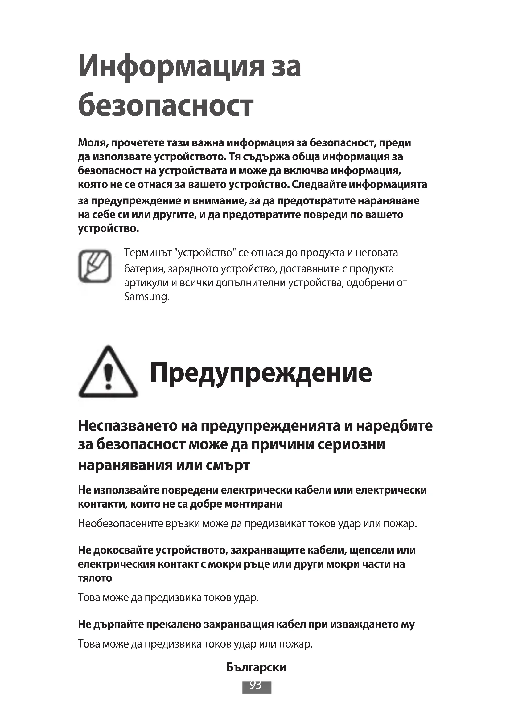 Информация за безопасност Моля, прочетете тази важна информация за безопасност, преди да използвате устройството. Тя съдържа обща информация за безопасност на устройствата и може да включва информация, която не се отнася за вашето устройство. Следвайте информацията за предупреждение и внимание, за да предотвратите нараняване на себе си или другите, и да предотвратите повреди по вашето устройство.Терминът "устройство" се отнася до продукта и неговата батерия, зарядното устройство, доставяните с продукта артикули и всички допълнителни устройства, одобрени от Samsung. Предупреждение Неспазването на предупрежденията и наредбите за безопасност може да причини сериозни наранявания или смърт Не използвайте повредени електрически кабели или електрически контакти, които не са добре монтираниНеобезопасените връзки може да предизвикат токов удар или пожар.Не докосвайте устройството, захранващите кабели, щепсели или електрическия контакт с мокри ръце или други мокри части на тялотоТова може да предизвика токов удар.Не дърпайте прекалено захранващия кабел при изваждането муТова може да предизвика токов удар или пожар.Български