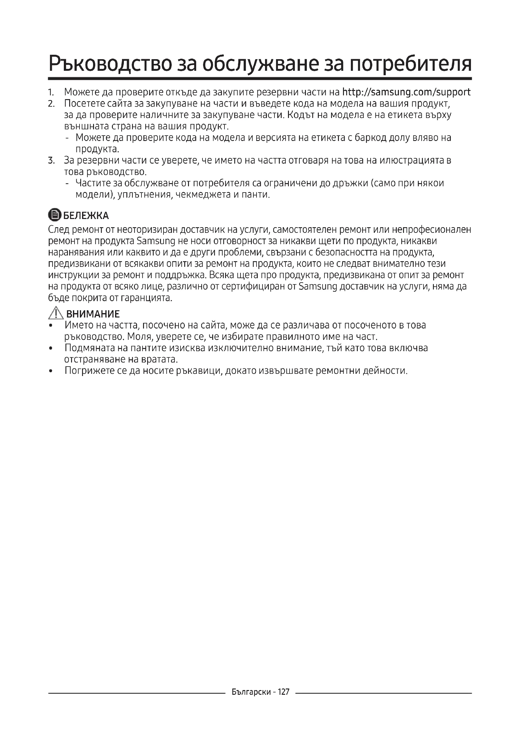 След ремонт от неоторизиран доставчик на услуги, самостоятелен ремонт или непрофесионален ремонт на продукта Samsung не носи отговорност за никакви щети по продукта, никакви наранявания или каквито и да е други проблеми, свързани с безопасността на продукта, предизвикани от всякакви опити за ремонт на продукта, които не следват внимателно тези инструкции за ремонт и поддръжка. Всяка щета про продукта, предизвикана от опит за ремонт на продукта от всяко лице, различно от сертифициран от Samsung доставчик на услуги, няма да бъде покрита от гаранцията.