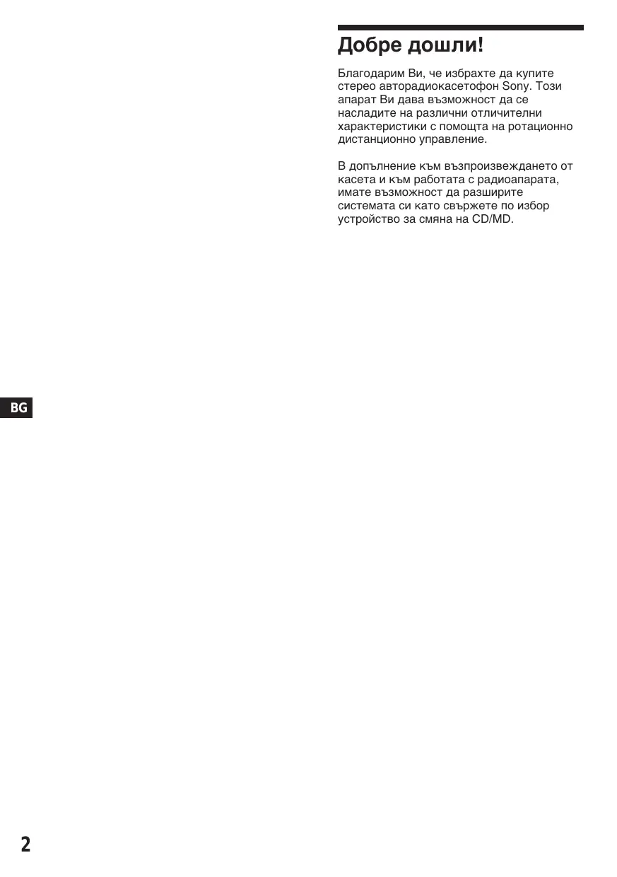 Добре дошли! Благодарим Ви, че избрахте да купите стерео авторадиокасетофон Sony. Този апарат Ви дава възможност да се насладите на различни отличителни характеристики с помощта на ротационно дистанционно управление. В допълнение към възпроизвеждането от касета и към работата с радиоапарата, имате възможност да разширите системата си като свържете по избор устройство за смяна на CD/MD.