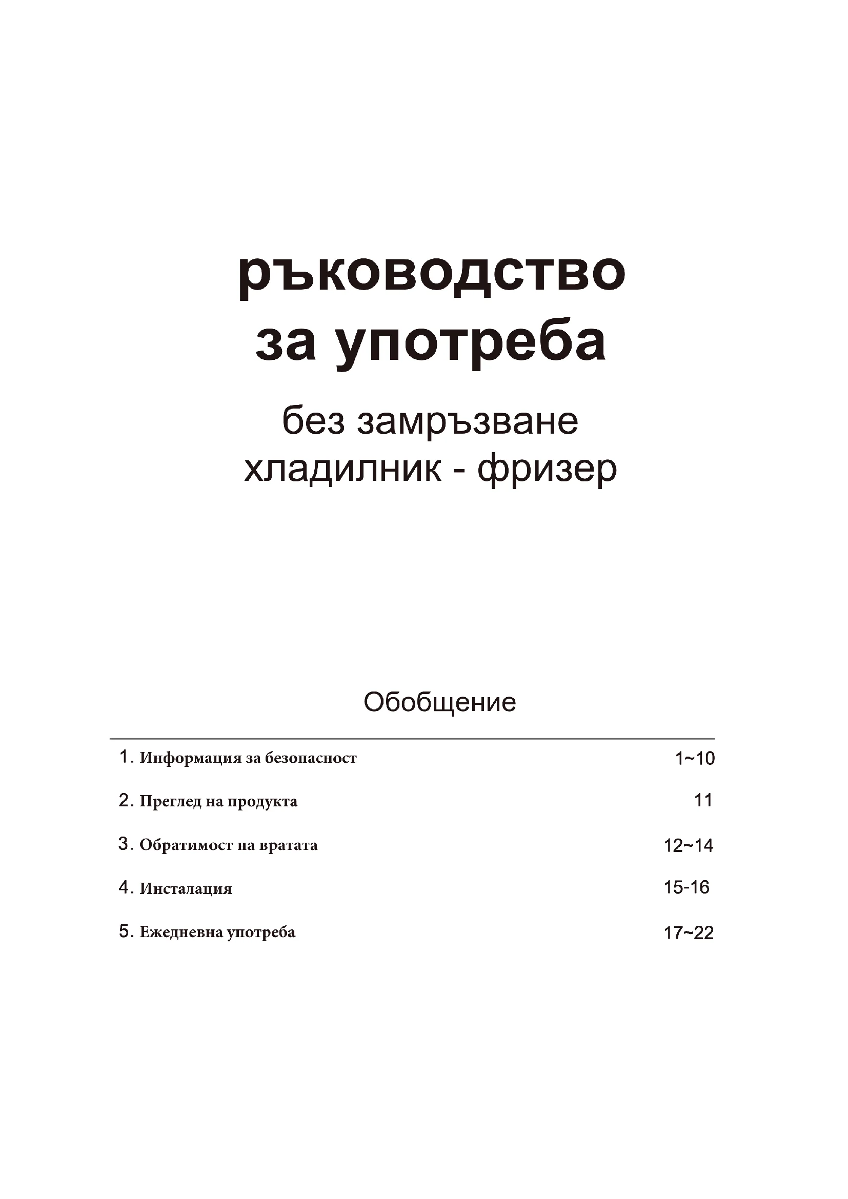 17~22 ръководство за употреба без замръзване хладилник - фризер 11Благодарим Ви за покупката на този продукт. Преди да използвате хладилника, прочетете внимателно това ръководство с инструкции, за да се възползвате напълно от неговите характеристики. Запазете цялата документация за последваща употреба или за други потребители. Този продукт е предназначен единствено за домашна употреба или подобни приложения, като например: - кухненската зона за персонал в магазини, офиси и други работни среди - в селски стопанства, от клиентела на хотели, мотели и други среди от жилищен тип - места за краткосрочно настаняване със закуска (квартири под наем) - за кетъринг услуги и други подобни приложения, не за продажби на дребно.
