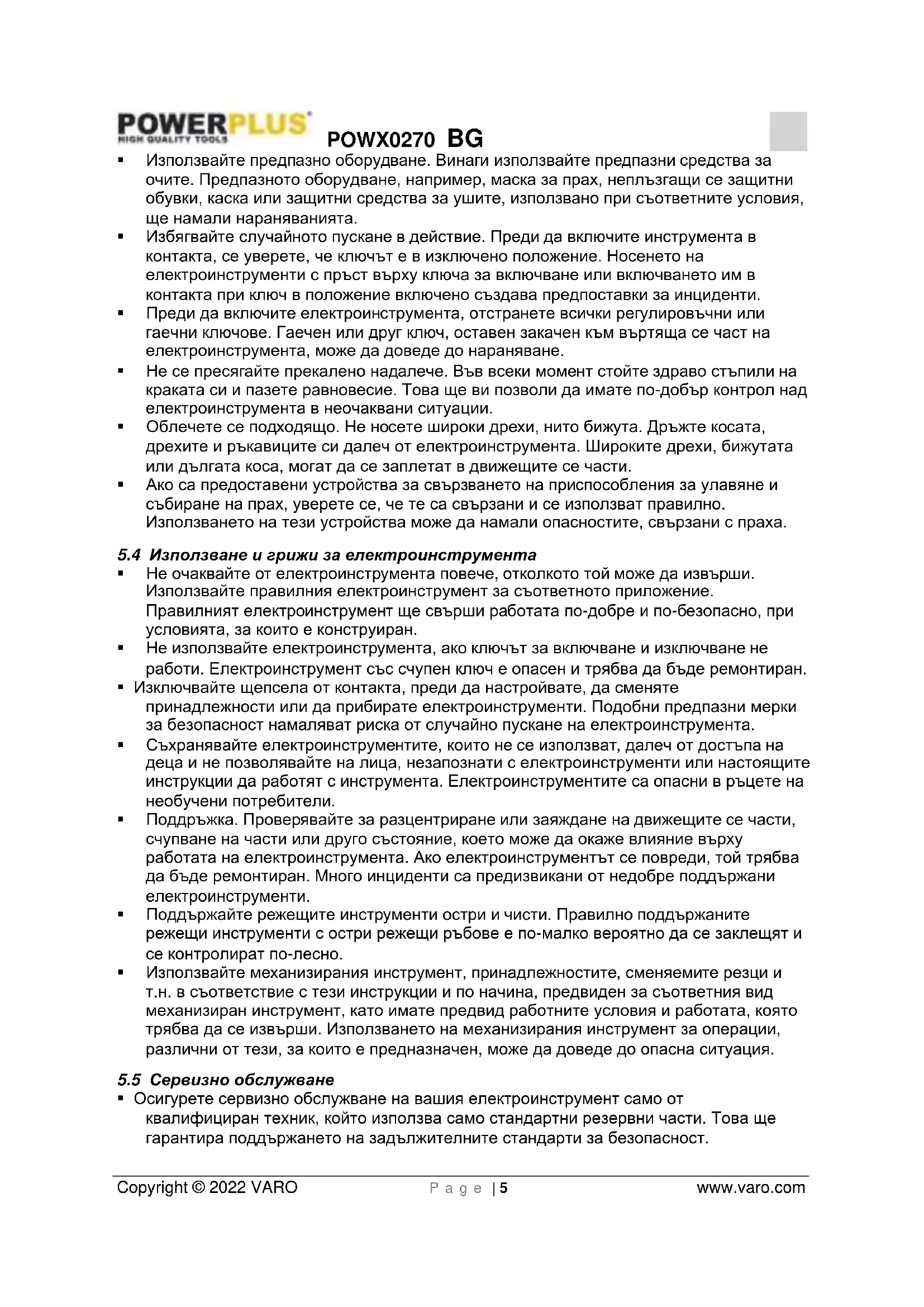 - Бъдете нащрек, внимавайте какво правите и използвайте здравия си разум, когато работите с електроинструменти. Не използвайте електроинструмента, когато сте уморени или сте под влиянието на наркотични вещества, алкохол или лекарства.POWX0270 BG Copyright © 2022 VARO P a g e | 4 www.varo.com Моментното невнимание при работа с електроинструменти може да доведе до сериозна телесна повреда.POWX0270 BG Copyright © 2022 VARO P a g e | 5 www.varo.com