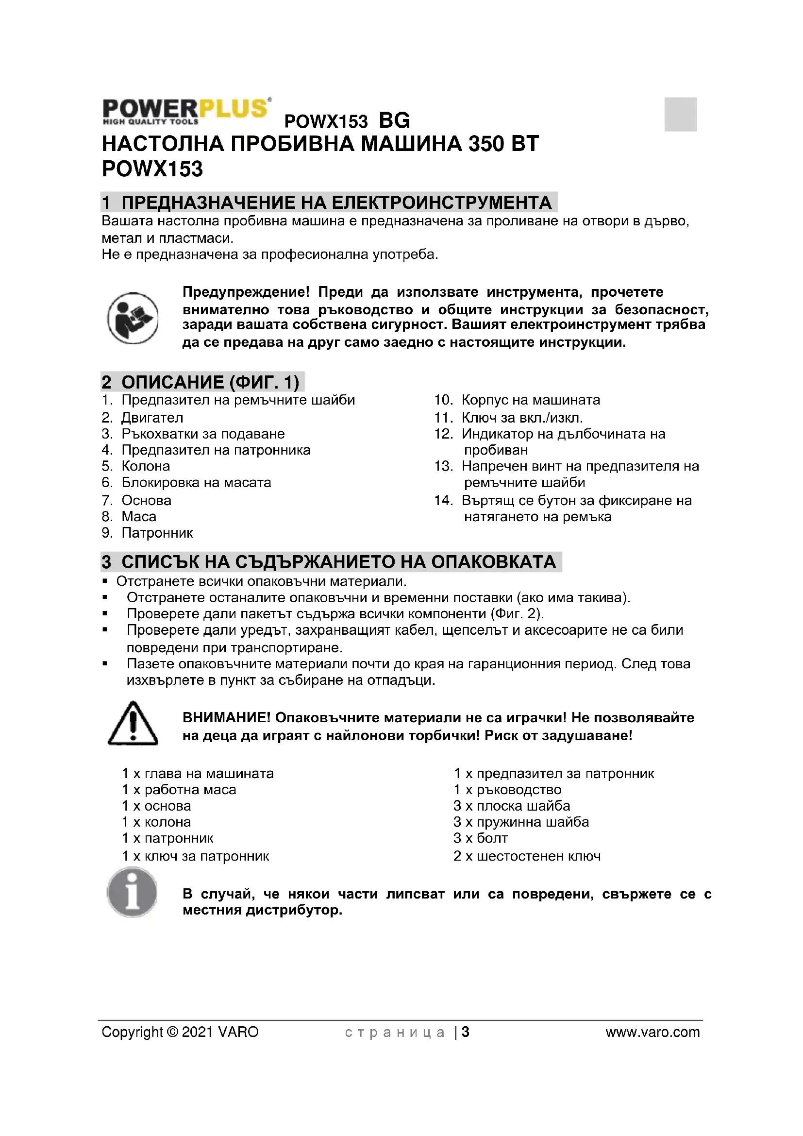 - Пазете опаковъчните материали почти до края на гаранционния период. След това изхвърлете в пункт за събиране на отпадъци. ВНИМАНИЕ! Опаковъчните материали не са играчки! Не позволявайте на деца да играят с найлонови торбички! Риск от задушаване! 1 x глава на машината 1 x работна маса 1 x основа 1 x колона 1 x патронник 1 x ключ за патронник 1 x предпазител за патронник 1 x ръководство 3 x плоска шайба 3 x пружинна шайба 3 x болт 2 x шестостенен ключ В случай, че някои части липсват или са повредени, свържете се с местния дистрибутор.POWX153 BG Copyright © 2021 VARO с т р а н и ц а | 4 www.varo.com 4 СИМВОЛИ В настоящия наръчник и/или върху машината са използвани следните символи