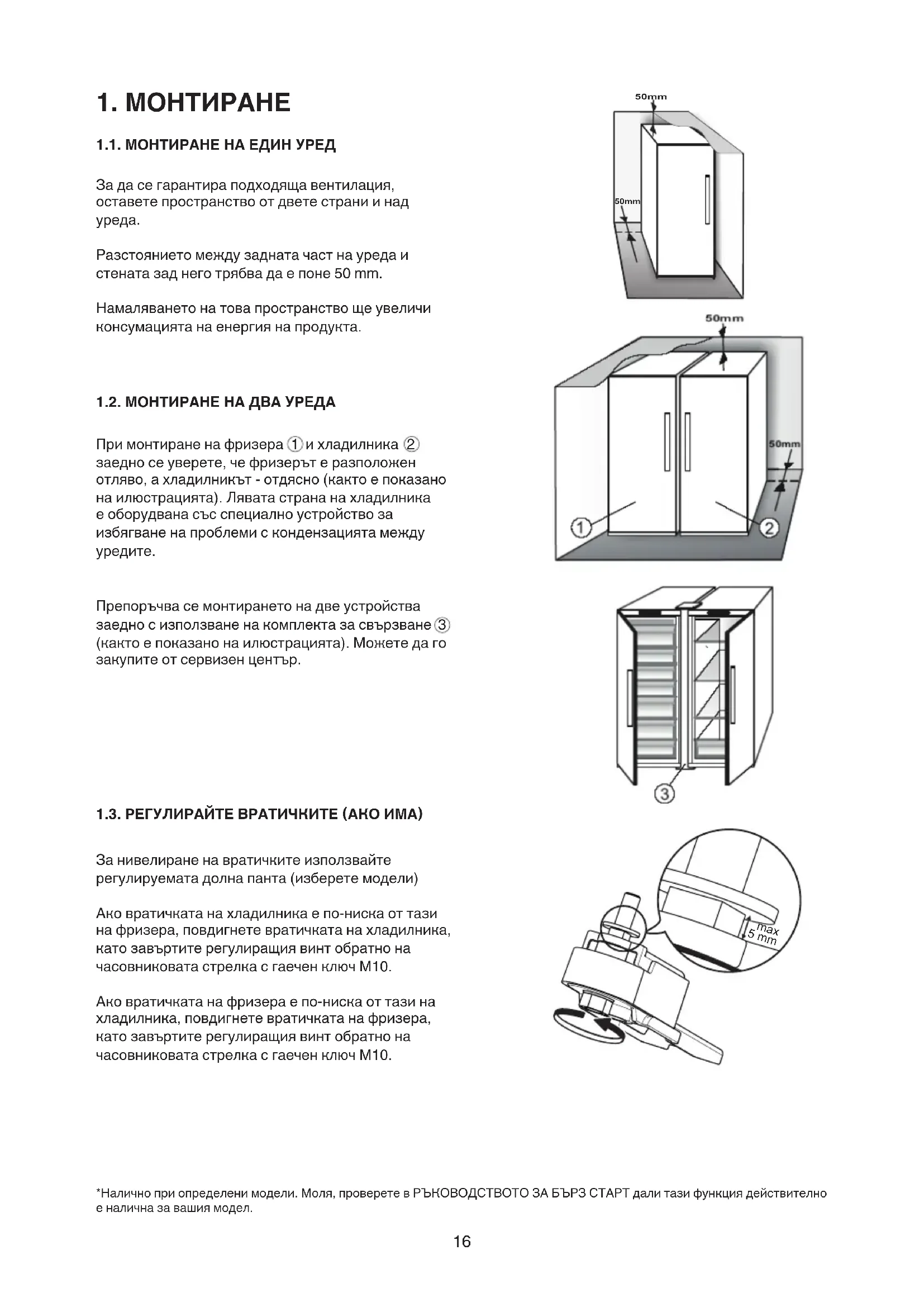 Разстояниетомеждузаднатачастнауредаи стенатазаднеготрябвадаепоне50mm. Намаляванетонатовапространствощеувеличи консумациятанаенергиянапродукта. 1.2. МОНТИРАНЕ НА ДВА УРЕДА Примонтираненафризера