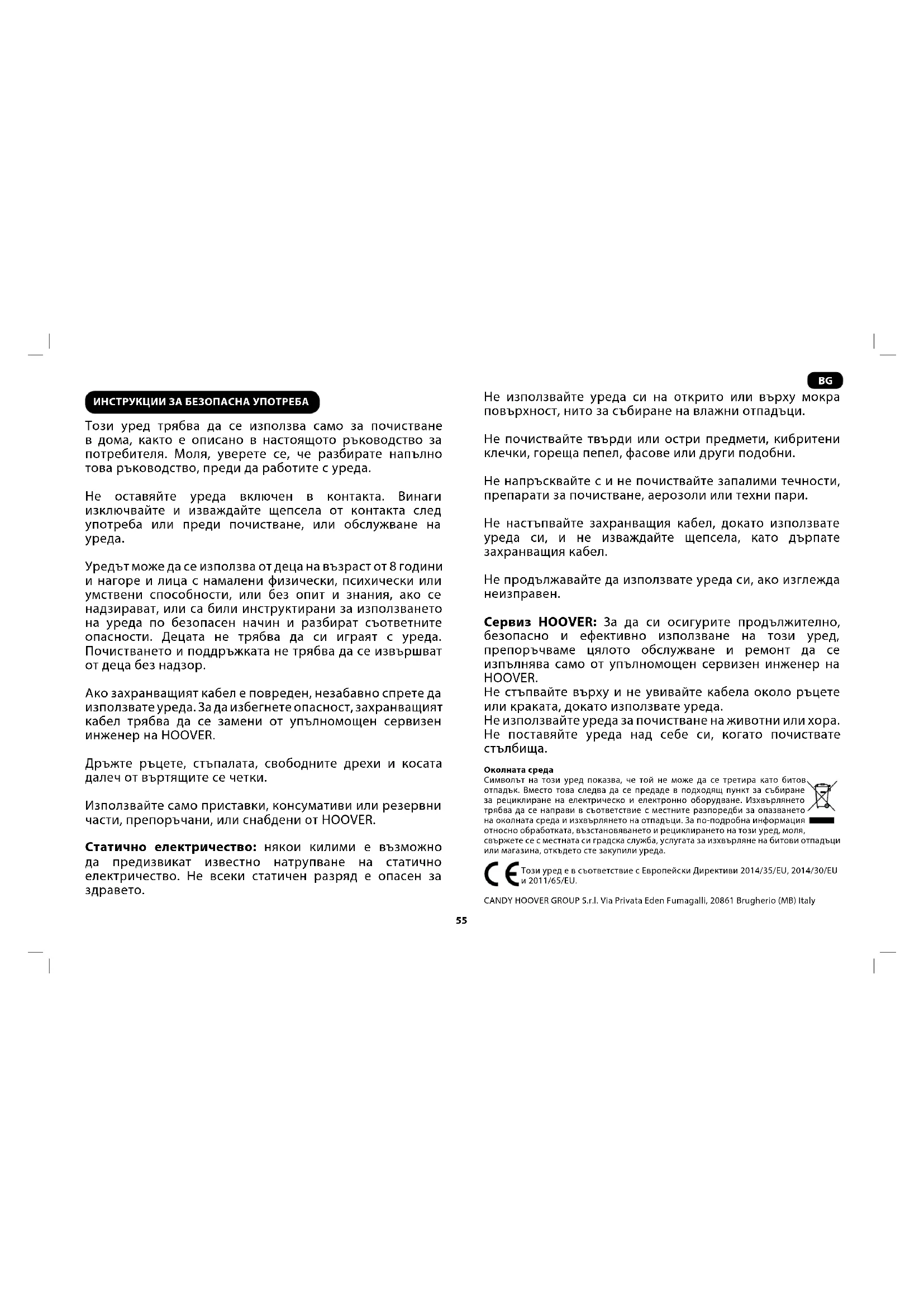 Уредът може да се използва от деца на възраст от 8 години и нагоре и лица с намалени физически, психически или умствени способности, или без опит и знания, ако се надзирават, или са били инструктирани за използването на уреда по безопасен начин и разбират съответните опасности. Децата не трябва да си играят с уреда. Почистването и поддръжката не трябва да се извършват от деца без надзор. Ако захранващият кабел е повреден, незабавно спрете да използвате уреда. За да избегнете опасност, захранващият кабел трябва да се замени от упълномощен сервизен инженер на HOOVER. Дръжте ръцете, стъпалата, свободните дрехи и косата далеч от въртящите се четки. Използвайте само приставки, консумативи или резервни части, препоръчани, или снабдени от HOOVER. Статично електричество: някои килими е възможно да предизвикат известно натрупване на статично електричество. Не всеки статичен разряд е опасен за