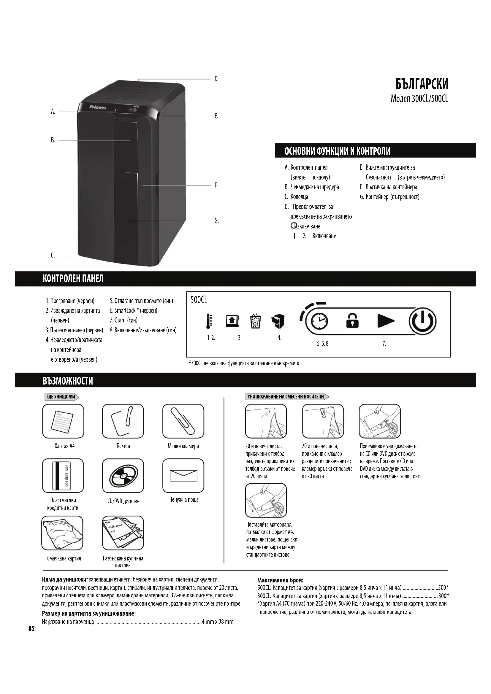 Модел 300CL/500CL Няма да унищожи: залепващи етикети, безконечна хартия, слепени документи, прозрачни носители, вестници, картон, спирали, индустриални телчета, повече от 20листа, прикачени с телчета или кламери, ламинирани материали, 3½-инчови дискети, папки за документи, рентгенови снимки или пластмасови елементи, различни от посочените по-горе Размер на хартията за унищожаване: Нарязване на парченца .................................................................................4 mm x 38 mm Максимален брой: 500CL: Капацитет за хартия (хартия с размери 8,5 инча x 11 инча) ...........................500* 300CL: Капацитет за хартия (хартия с размери 8,5 инча x 11 инча) ...........................300*