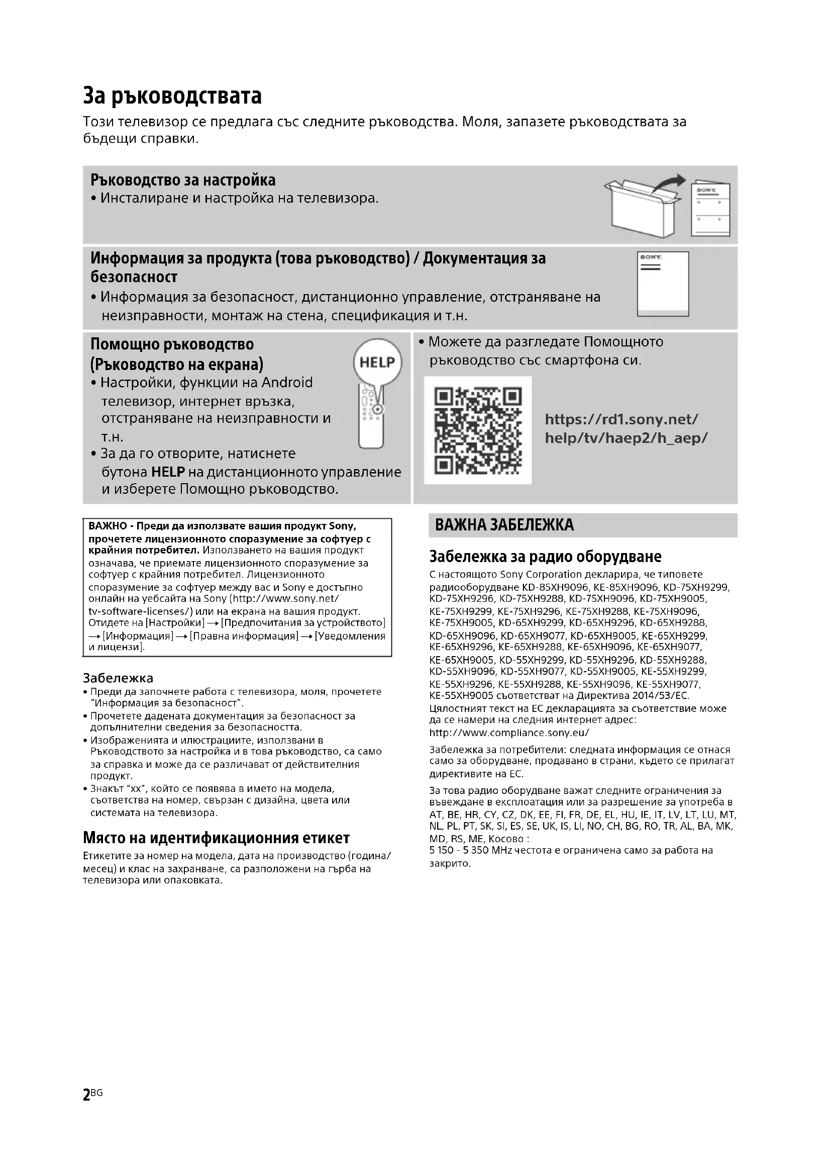 - Преди да започнете работа с телевизора, моля, прочетете “Информация за безопасност”.• Прочетете дадената документация за безопасност за допълнителни сведения за безопасността.• Изображенията и илюстрациите, използвани в Ръководството за настройка и в това ръководство, са само за справка и може да се различават от действителния продукт.• Знакът “xx”, който се появява в името на модела, съответства на номер, свързан с дизайнa, цвета или системата на телевизора. Място на идентификационния етикет Етикетите за номер на модела, дата на производство (година/месец) и клас на захранване, са разположени на гърба на телевизора или опаковката. ВАЖНА ЗАБЕЛЕЖКА Забележка за радио оборудване С настоящото Sony Corporation декларира, че типовете радиооборудване KD-85XH9096, KE-85XH9096, KD-75XH9299, KD-75XH9296, KD-75XH9288, KD-75XH9096, KD-75XH9005, KE-75XH9299, KE-75XH9296, KE-75XH9288, KE-75XH9096, KE-75XH9005, KD-65XH9299, KD-65XH9296, KD-65XH9288, KD-65XH9096, KD-65XH9077, KD-65XH9005, KE-65XH9299, KE-65XH9296, KE-65XH9288, KE-65XH9096, KE-65XH9077, KE-65XH9005, KD-55XH9299, KD-55XH9296, KD-55XH9288, KD-55XH9096, KD-55XH9077, KD-55XH9005, KE-55XH9299, KE-55XH9296, KE-55XH9288, KE-55XH9096, KE-55XH9077, KE-55XH9005 съответстват на Директива 2014/53/ЕС. Цялостният текст на ЕС декларацията за съответствие може да се намери на следния интернет адрес: http://www.compliance.sony.eu/Забележка за потребители: следната информация се отнася само за оборудване, продавано в страни, където се прилагат директивите на ЕС.За това радио оборудване важат следните ограничения за въвеждане в експлоатация или за разрешение за употреба в AT, BE, HR, CY, CZ, DK, EE, FI, FR, DE, EL, HU, IE, IT, LV, LT, LU, MT, NL, PL, PT, SK, SI, ES, SE, UK, IS, LI, NO, CH, BG, RO, TR, AL, BA, MK, MD, RS, ME, Косово : 5 150 - 5 350 MHz честота е ограничена само за работа на За ръководствата Този телевизор се предлага със следните ръководства. Моля, запазете ръководствата за бъдещи справки. Ръководство за настройка