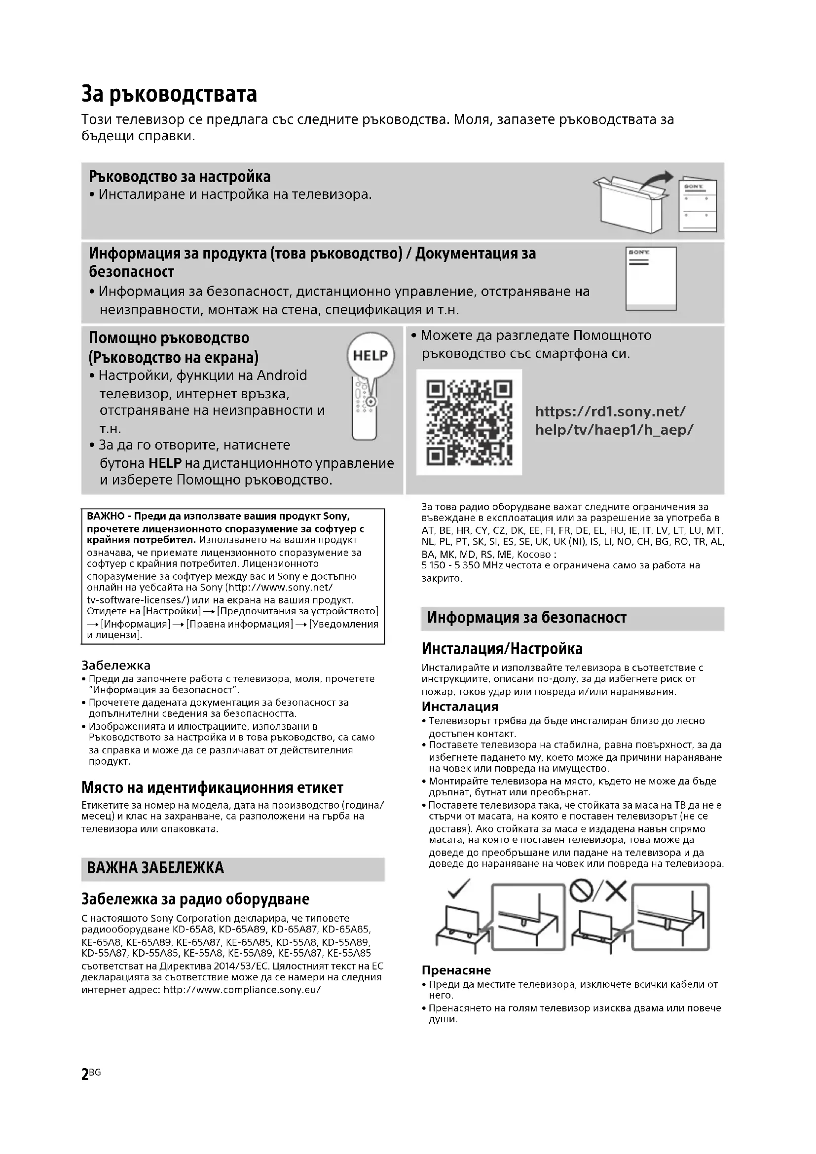 - Преди да започнете работа с телевизора, моля, прочетете “Информация за безопасност”.• Прочетете дадената документация за безопасност за допълнителни сведения за безопасността.• Изображенията и илюстрациите, използвани в Ръководството за настройка и в това ръководство, са само за справка и може да се различават от действителния продукт. Място на идентификационния етикет Етикетите за номер на модела, дата на производство (година/месец) и клас на захранване, са разположени на гърба на телевизора или опаковката. ВАЖНА ЗАБЕЛЕЖКА Забележка за радио оборудване С настоящото Sony Corporation декларира, че типовете радиооборудване KD-65A8, KD-65A89, KD-65A87, KD-65A85, KE-65A8, KE-65A89, KE-65A87, KE-65A85, KD-55A8, KD-55A89, KD-55A87, KD-55A85, KE-55A8, KE-55A89, KE-55A87, KE-55A85 съответстват на Директива 2014/53/ЕС. Цялостният текст на ЕС декларацията за съответствие може да се намери на следния интернет адрес: http://www.compliance.sony.eu/За това радио оборудване важат следните ограничения за въвеждане в експлоатация или за разрешение за употреба в AT, BE, HR, CY, CZ, DK, EE, FI, FR, DE, EL, HU, IE, IT, LV, LT, LU, MT, NL, PL, PT, SK, SI, ES, SE, UK, UK (NI), IS, LI, NO, CH, BG, RO, TR, AL, BA, MK, MD, RS, ME, Косово : 5 150 - 5 350 MHz честота е ограничена само за работа на Информация за безопасност Инсталация/Настройка Инсталирайте и използвайте телевизора в съответствие с инструкциите, описани по-долу, за да избегнете риск от пожар, токов удар или повреда и/или наранявания.