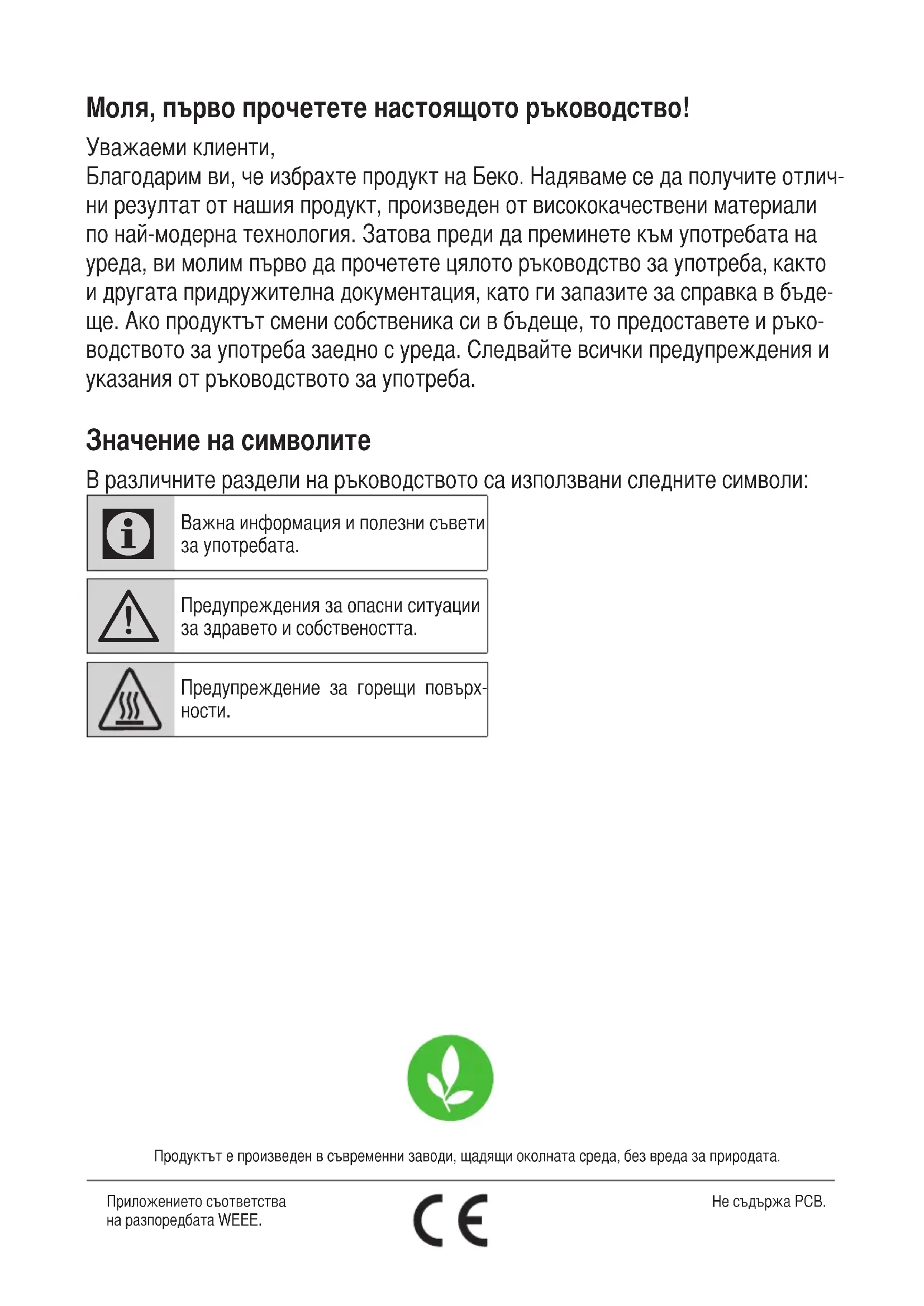 määrdunud. Määrdunud osade puhastamise kohta lugege jaotisest "Puhastamine ja hooldus".Моля, първо прочетете настоящото ръководство! Уважаеми клиенти, Благодарим ви, че избрахте продукт на Беко. Надяваме се да получите отлич- ни резултат от нашия продукт, произведен от висококачествени материали по най-модерна технология. Затова преди да преминете към употребата на уреда, ви молим първо да прочетете цялото ръководство за употреба, както и другата придружителна документация, като ги запазите за справка в бъде- ще. Ако продуктът смени собственика си в бъдеще, то предоставете и ръко- водството за употреба заедно с уреда. Следвайте всички предупреждения и указания от ръководството за употреба. Значение на символите В различните раздели на ръководството са използвани следните символи: