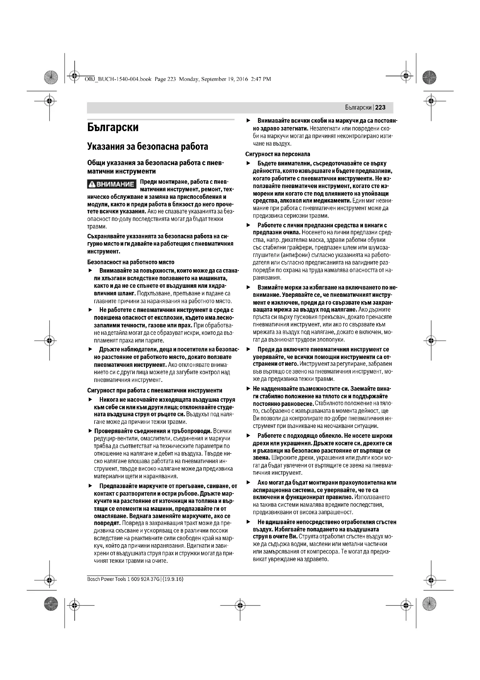 При работа с този пневматичен инструмент заемай- те удобна позиция, внимавайте да сте в стабилно по- ложение на тялото и избягвайте неудобните пози- OBJ_BUCH-1540-004.book Page 224 Monday, September 19, 2016 2:47 PMБългарски | 225 Bosch Power Tools 1 609 92A 37G | (19.9.16) ции или такива, при които поддържате равновесие с усилие. При извършване на продължителни дейнос- ти работещият с пневматичния инструмент трябва периодично да променя положението на тялото си, което помага за намаляване на неприятните усеща- ния и умората. Ако работещият с пневматичния инструмент усеща симптоми като неразположение, тежест, сърцебие- не, болка, сърбежи, заглъхване на ушите, парене или скованост, тези признаци не трябва да бъдат иг- норирани. Работникът трябва да информира работо- дателя си и да се консултира с квалифицирано меди- цинско лице. Внимание! При продължителни използване на пнев- матичния инструмент работните инструменти могат да се нагорещят. Използвайте предпазни ръкавици. Използвайте подходящи уреди, за да проверите за наличието на скрити под повърхността електро- и/или тръбопроводи, или се обърнете за информа- ция към съответните местни снабдителни служби. Влизането на работния инструмент в съприкосновение с електропроводи може да предизвика пожар или то- ков удар. Увреждането на газопровод може да предиз- вика експлозия. Увреждането на водопровод предиз- виква значителни материални щети. Избягвайте допиране на електрически проводници под напрежение. Пневматичният инструмент не е изо- лиран и съприкосновението му с проводник под напре- жение може да предизвика токов удар. Отделящият се при шмиргелене, рязане, шлифоване, пробиване и др.п. дейности прах може да бъде канцерогенен, да ув- режда плода на бременни жени или да предизвиква из- менения на наследствената информация. Някои от съ- държащите се в този прах вещества са: – олово в оловосъдържащи бои и лакове; – кристален силициев двуокис в тухли и керемиди, ци-