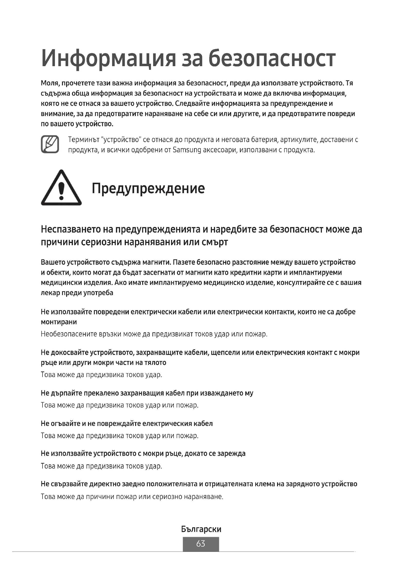 Информация за безопасност Моля, прочетете тази важна информация за безопасност, преди да използвате устройството. Тя съдържа обща информация за безопасност на устройствата и може да включва информация, която не се отнася за вашето устройство. Следвайте информацията за предупреждение и внимание, за да предотвратите нараняване на себе си или другите, и да предотвратите повреди по вашето устройство. Терминът "устройство" се отнася до продукта и неговата батерия, артикулите, доставени с продукта, и всички одобрени от Samsung аксесоари, използвани с продукта. Предупреждение Неспазването на предупрежденията и наредбите за безопасност може да причини сериозни наранявания или смърт Вашето устройството съдържа магнити. Пазете безопасно разстояние между вашето устройство и обекти, които могат да бъдат засегнати от магнити като кредитни карти и имплантируеми медицински изделия. Ако имате имплантируемо медицинско изделие, консултирайте се с вашия лекар преди употреба Не използвайте повредени електрически кабели или електрически контакти, които не са добре
