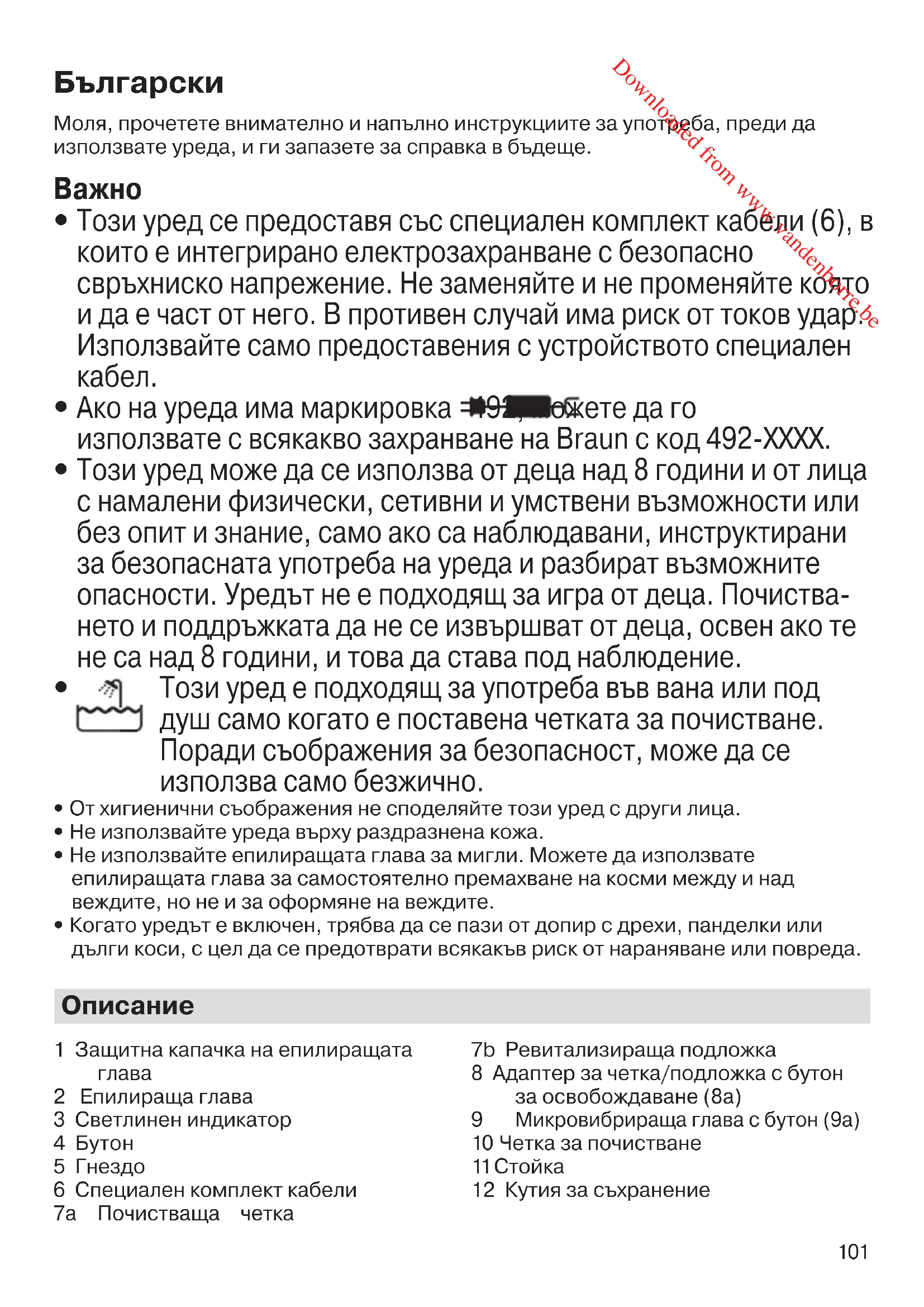 Нашите продукти са с гаранция 2 години, считано от датата на покупката. В рамките на гаранционния срок безплатно се отстраняват дефектите в материалите и производството чрез поправка, смяна на части или целия уред, по преценка на сервизния център. Тази гаранция се признава във всички страни, където Braun и неговият изключителен дистрибутор продават този уред и няма ограничение за внос или официална разпоредба не забранява да се извърши предвиденото гаранционно обслужване. Гаранцията не покрива: повреди от неправилна употреба (работа при неподходящо напрежение, включване в неподходящ източник на електрически ток, счупване); износване и незначителни дефекти, които не пречат на нормалната работа на уреда. Гаранцията не се признава при поправка на уреда от неоторизирани лица или ако не са използвани оригинални резервни части на Braun. Гаранцията е валидна при правилно попълнени: дата на покупката, печат и подпис в гаранционната карта. За всички рекламации, възникнали в гаранционния срок, изпратете уреда както и гаранционната му карта в най-близкия сервиз на Braun. За справки 0800 11 003 – национален телефон на БГ сервиз без увеличение на телефонната услуга или www.bgs.bg. 91474612_FaceSpa_Pro_910-911-912-913_921_EURO_S4-122.indd 10591474612_FaceSpa_Pro_910-911-912-913_921_EURO_S4-122.indd 105 17.08.17 15:1517.08.17 15:15 CSS APPROVED Effective Date 18Aug2017 GMT - Printed 17Oct2017 Page 105 of 122 Downloaded from www.vandenborre.be106 Руководство по эксплуатации Перед началом эксплуатации прибора внимательно ознакомьтесь со всеми инструкциями и сохраните их на будущее.