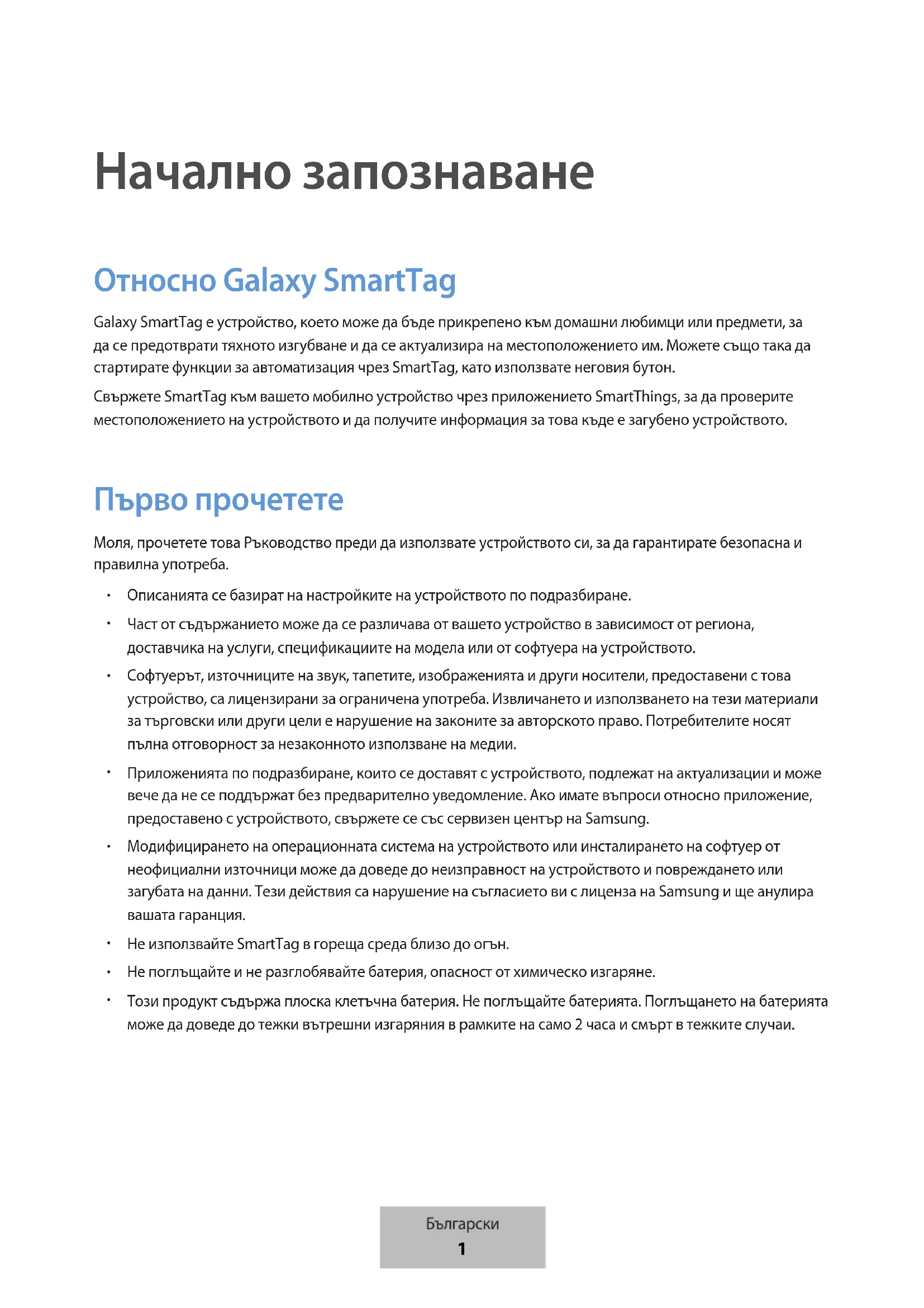 Начално запознаване Относно Galaxy SmartTag Galaxy SmartTag е устройство, което може да бъде прикрепено към домашни любимци или предмети, за да се предотврати тяхното изгубване и да се актуализира на местоположението им. Можете също така да стартирате функции за автоматизация чрез SmartTag, като използвате неговия бутон.Свържете SmartTag към вашето мобилно устройство чрез приложението SmartThings, за да проверите местоположението на устройството и да получите информация за това къде е загубено устройството. Първо прочетете Моля, прочетете това Ръководство преди да използвате устройството си, за да гарантирате безопасна и правилна употреба. Описанията се базират на настройките на устройството по подразбиране. Част от съдържанието може да се различава от вашето устройство в зависимост от региона, доставчика на услуги, спецификациите на модела или от софтуера на устройството. Софтуерът, източниците на звук, тапетите, изображенията и други носители, предоставени с това устройство, са лицензирани за ограничена употреба. Извличането и използването на тези материали за търговски или други цели е нарушение на законите за авторското право. Потребителите носят пълна отговорност за незаконното използване на медии. Приложенията по подразбиране, които се доставят с устройството, подлежат на актуализации и може вече да не се поддържат без предварително уведомление. Ако имате въпроси относно приложение, предоставено с устройството, свържете се със сервизен център на Samsung. Модифицирането на операционната система на устройството или инсталирането на софтуер от неофициални източници може да доведе до неизправност на устройството и повреждането или загубата на данни. Тези действия са нарушение на съгласието ви с лиценза на Samsung и ще анулира вашата гаранция. Не използвайте SmartTag в гореща среда близо до огън. Не поглъщайте и не разглобявайте батерия, опасност от химическо изгаряне. Този продукт съдържа плоска клетъчна батерия. Не поглъщайте батерията. Поглъщането на батерията може да доведе до тежки вътрешни изгаряния в рамките на само 2 часа и смърт в тежките случаи.