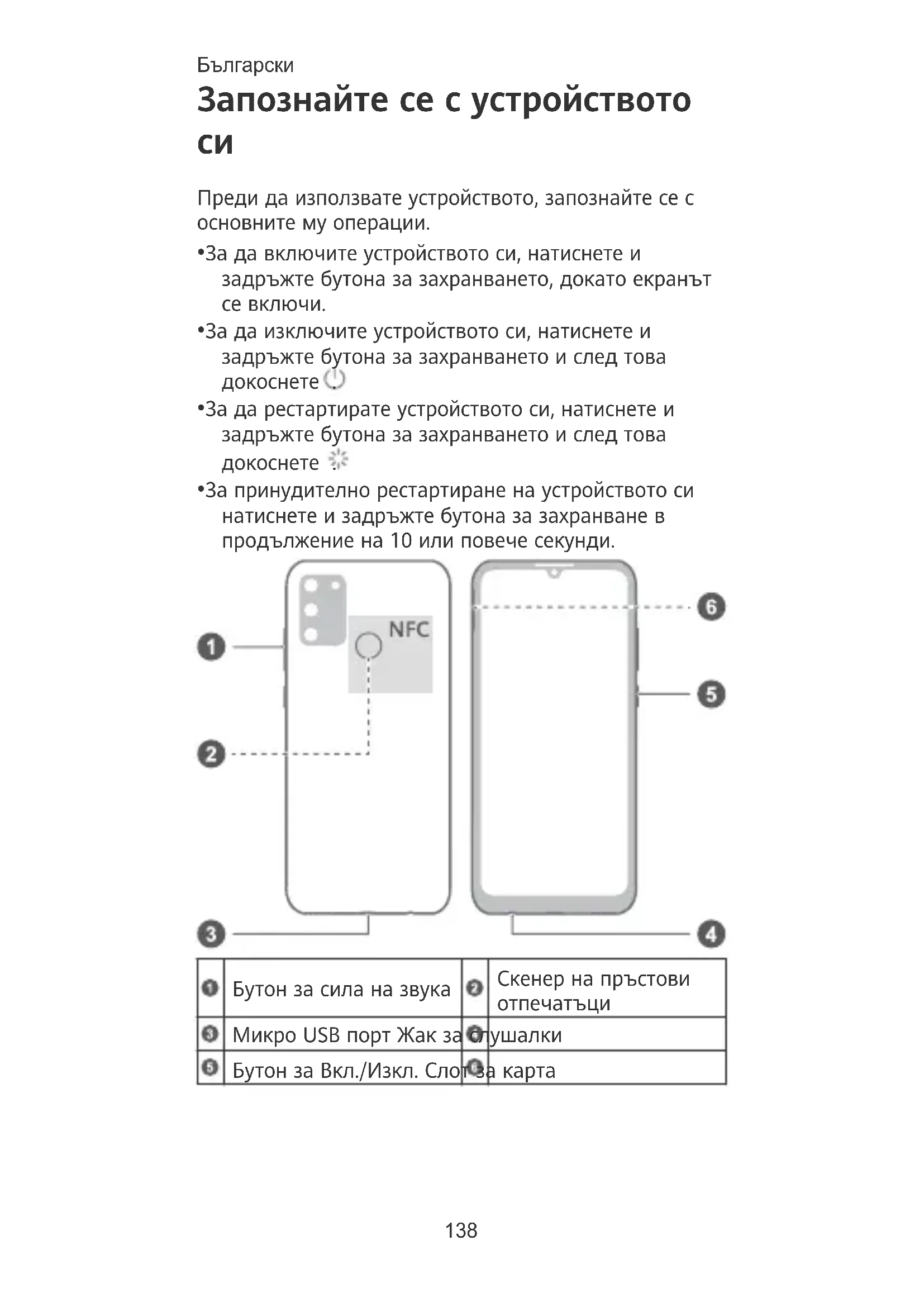 - За принудително рестартиране на устройството си натиснете и задръжте бутона за захранване в продължение на 10 или повече секунди. Бутон за сила на звука Скенер на пръстови