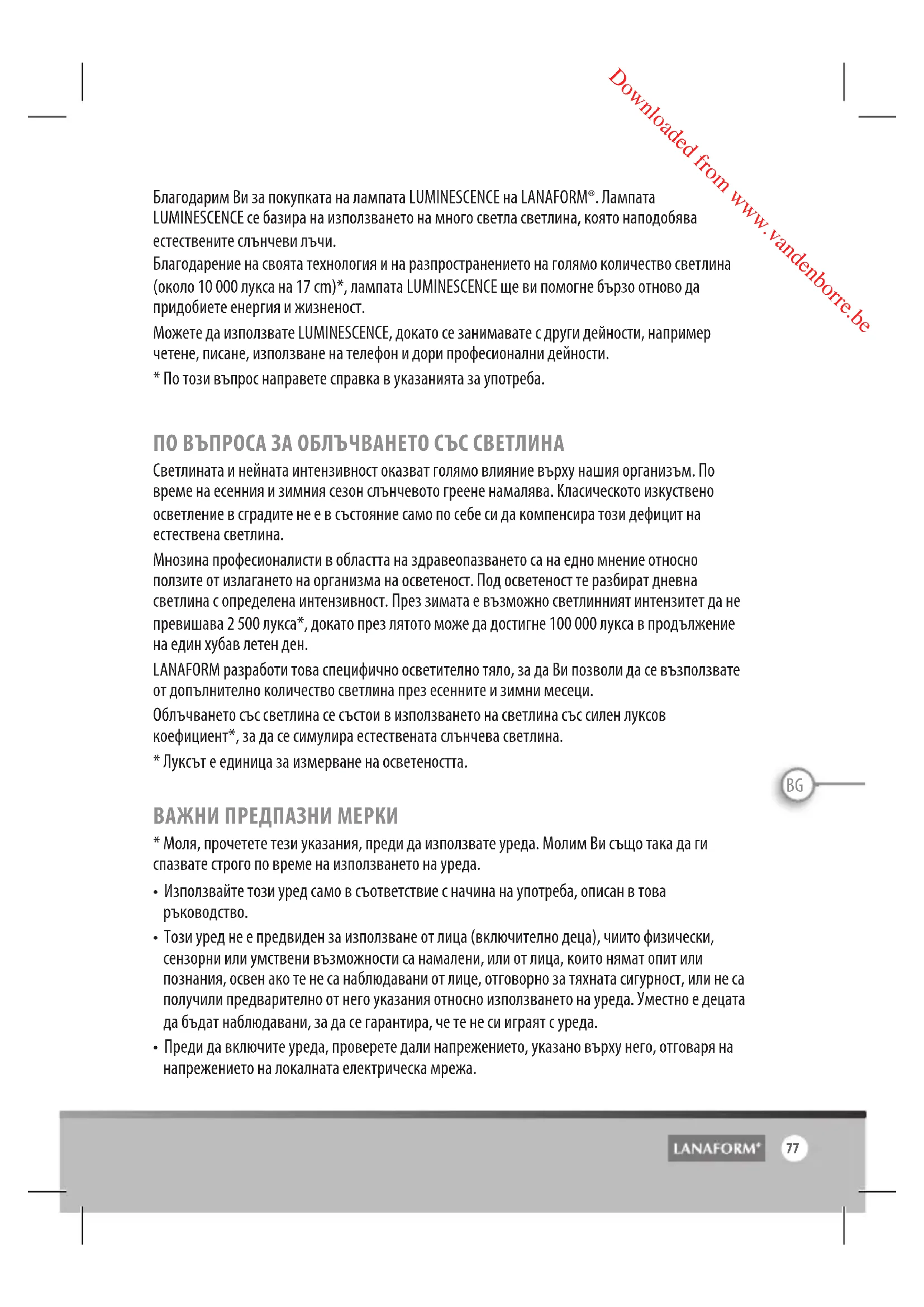Downloaded from www.vandenborre.beBG Благодарим Ви за покупката на лампата LUMINESCENCE на LANAFORM®. Лампата LUMINESCENCE се базира на използването на много светла светлина, която наподобява естествените слънчеви лъчи. Благодарение на своята технология и на разпространението на голямо количество светлина (около 10 000 лукса на 17 cm)*, лампата LUMINESCENCE ще ви помогне бързо отново да придобиете енергия и жизненост. Можете да използвате LUMINESCENCE, докато се занимавате с други дейности, например четене, писане, използване на телефон и дори професионални дейности.