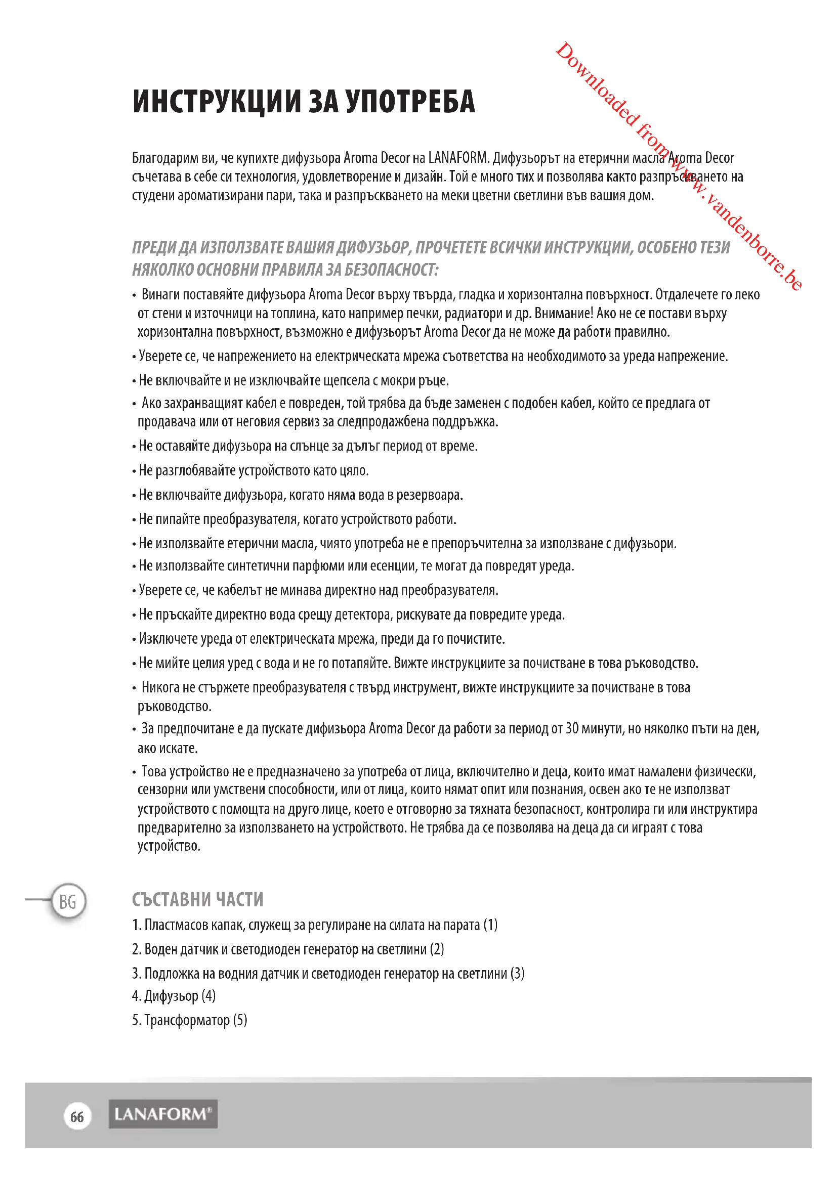 Downloaded from www.vandenborre.beИНСТРУКЦИИ ЗА УПОТРЕБА Благодарим ви, че купихте дифузьора Aroma Decor на LANAFORM. Дифузьорът на етерични масла Aroma Decor съчетава в себе си технология, удовлетворение и дизайн. Той е много тих и позволява както разпръскването на студени ароматизирани пари, така и разпръскването на меки цветни светлини във вашия дом. ПРЕДИ ДА ИЗПОЛЗВАТЕ ВАШИЯ ДИФУЗЬОР, ПРОЧЕТЕТЕ ВСИЧКИ ИНСТРУКЦИИ, ОСОБЕНО ТЕЗИ НЯКОЛКО ОСНОВНИ ПРАВИЛА ЗА БЕЗОПАСНОСТ: