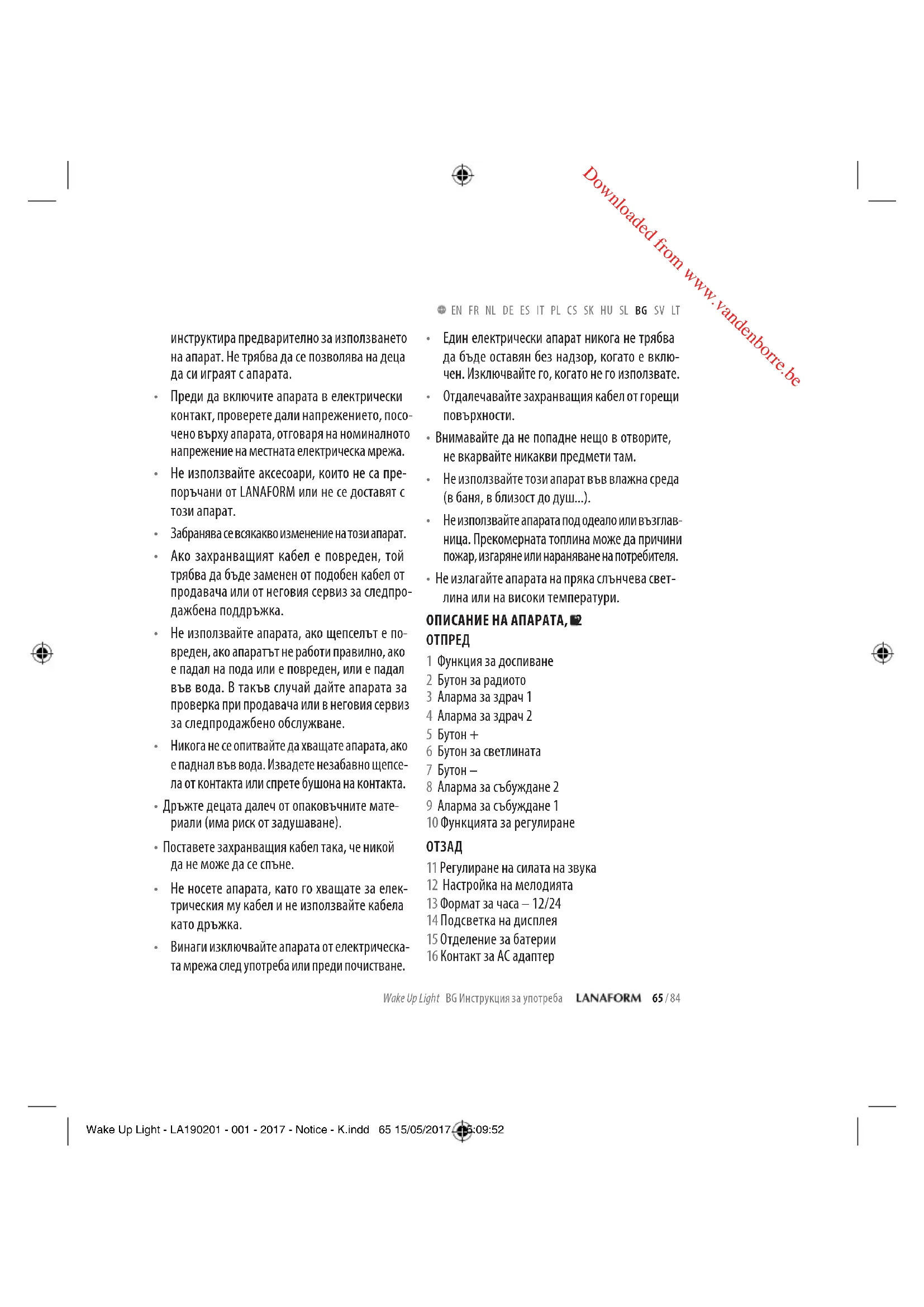 Този апарат не е предназначен за употреба от лица, включително и деца, които имат на- малени физически, сензорни или умствени способности, или от лица, които нямат опит или познания, освен ако те не използват апарат с помощта на друго лице, което е отговор- но за тяхната безопасност, контролира или Wake Up Light - LA190201 - 001 - 2017 - Notice - K.indd 64 15/05/2017 15:09:52 Downloaded from www.vandenborre.beWake Up Light BG Инструкция за употреба 65 / 84 EN FR NL DE ES IT PL CS SK HU SL BG SV LT инструктира предварително за използването на апарат. Не трябва да се позволява на деца да си играят с апарата.