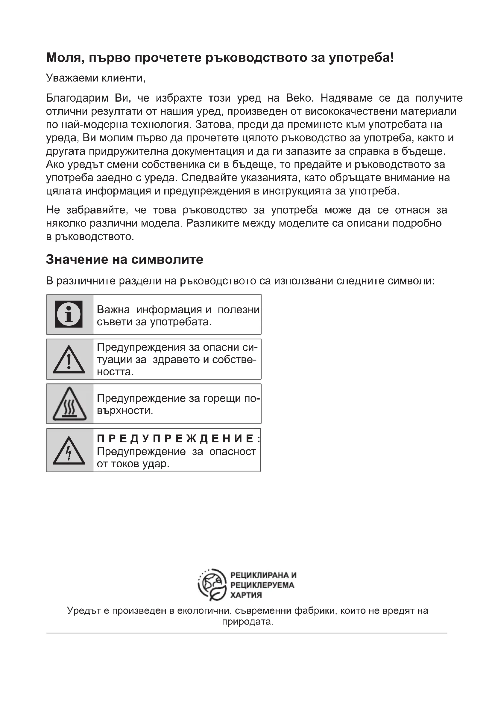 - Уредът може да се из- ползва от деца, които са на възраст над 8 години и от лица с ограничени физически, сензорни или умствени възмож- ности, или които нямат познания и опит, ако те бъдат наблюдавани по отношение на безо- пасното му използване или са инструктирани и разбират рисковете от използването на проду- кта. Децата не трябва да играят с уреда. Про- цедурите за почистване и потребителска под- дръжка не трябва да се извършват от деца, 1 Важни инструкции за безопасност и опазване на околната среда освен ако не са контро- лирани от възрастни.