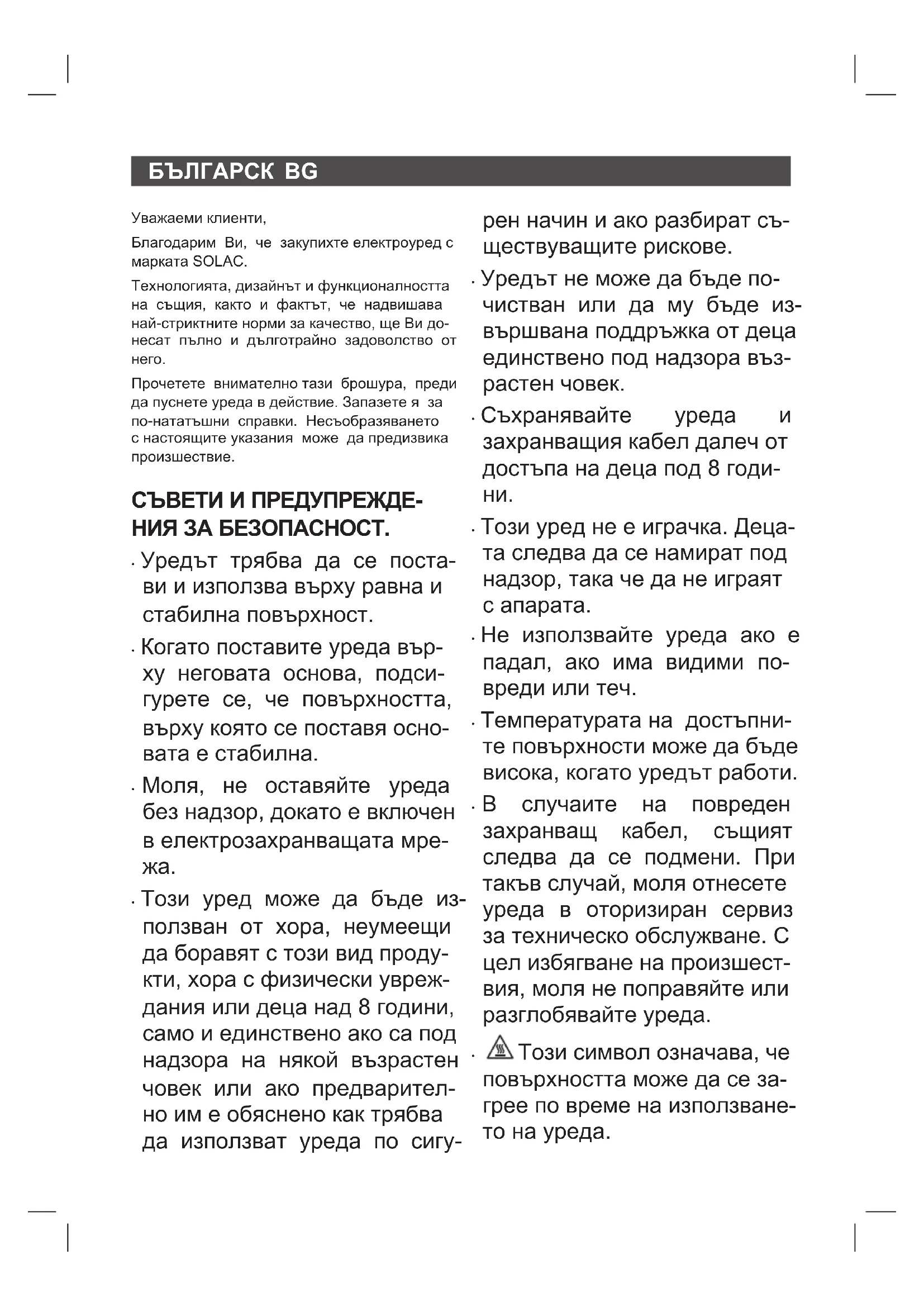 Прочетете внимателно тази брошура, преди да пуснете уреда в действие. Запазете я за по-нататъшни справки. Несъобразяването с настоящите указания може да предизвика произшествие. СЪВЕТИ И ПРЕДУПРЕЖДЕ- НИЯ ЗА БЕЗОПАСНОСТ.