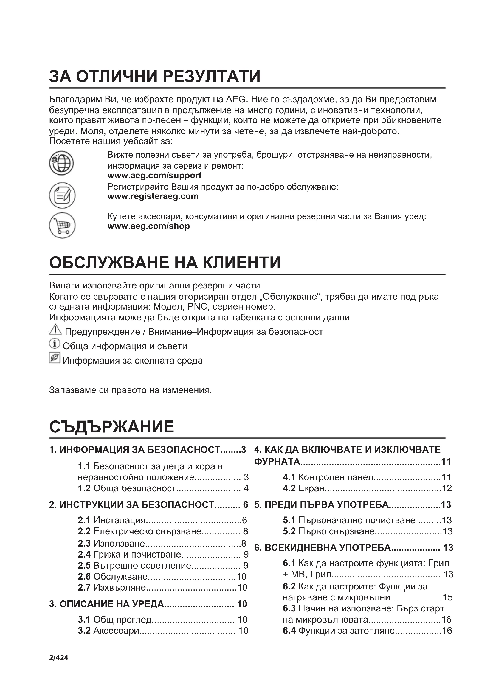 UKЗА ОТЛИЧНИ РЕЗУЛТАТИ Благодарим Ви, че избрахте продукт на AEG. Ние го създадохме, за да Ви предоставим безупречна експлоатация в продължение на много години, с иновативни технологии, които правят живота по-лесен – функции, които не можете да откриете при обикновените уреди. Моля, отделете няколко минути за четене, за да извлечете най-доброто. Посетете нашия уебсайт за: Вижте полезни съвети за употреба, брошури, отстраняване на неизправности, информация за сервиз и ремонт: www.aeg.com/support Регистрирайте Вашия продукт за по-добро обслужване: www.registeraeg.com Купете аксесоари, консумативи и оригинални резервни части за Вашия уред: www.aeg.com/shop ОБСЛУЖВАНЕ НА КЛИЕНТИ Винаги използвайте оригинални резервни части. Когато се свързвате с нашия оторизиран отдел „Обслужване“, трябва да имате под ръка следната информация: Модел, PNC, сериен номер. Информацията може да бъде открита на табелката с основни данни Предупреждение / Внимание–Информация за безопасност Обща информация и съвети Информация за околната среда Запазваме си правото на изменения.
