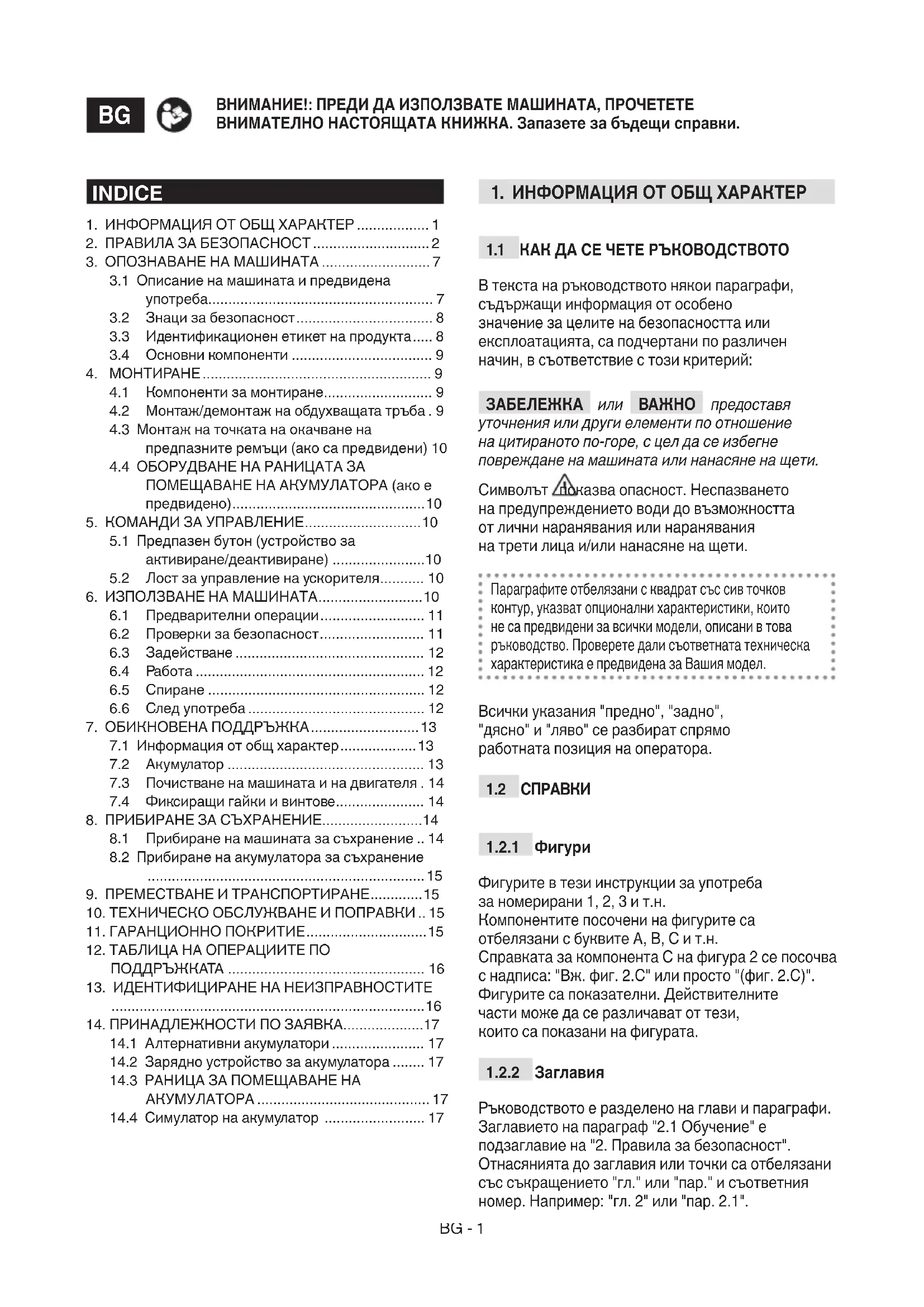 Ръководството е разделено на глави и параграфи. Заглавието на параграф "2.1 Обучение" е подзаглавие на "2. Правила за безопасност". Отнасянията до заглавия или точки са отбелязани със съкращението "гл." или "пар." и съответния номер. Например: "гл. 2" или "пар. 2.1". INDICE