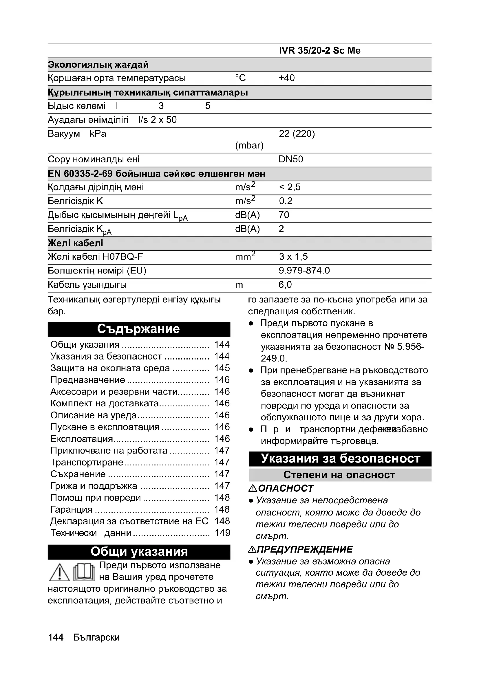 Опасност от наранявания и повреди при засмукване на запалими материали, при късо съединение или други електрически повреди Опасност от вдишване на вредни за здравето газове, опасност от токов удар, опасност поради изгаряния. При авария изключете уреда и извадете щепсела. Защита на околната среда Опаковъчните материали подлежат на рециклиране. Моля, изхвърляйте опаковките по съобразен с околната среда начин. Електрическите и електронните уреди съдържат ценни материали, подлежащи на рециклиране, а често и съставни части, напр. батерии, акумулаторни батерии или масло, които при неправилно боравене или изхвърляне могат да представляват потенциална опасност за човешкото здраве и за околната среда. За правилното функциониране на уреда все пак тези съставни части са необходими. Обозначените с този символ уреди не трябва да бъдат изхвърляни заедно с битовите отпадъци. Указания за съставни вещества (REACH) Актуална информация за съставките ще намерите на интернет страница: www.kaercher.de/REACH146 Български Предназначение 몇 ПРЕДУПРЕЖДЕНИЕ Вдишване на опасни за здравето