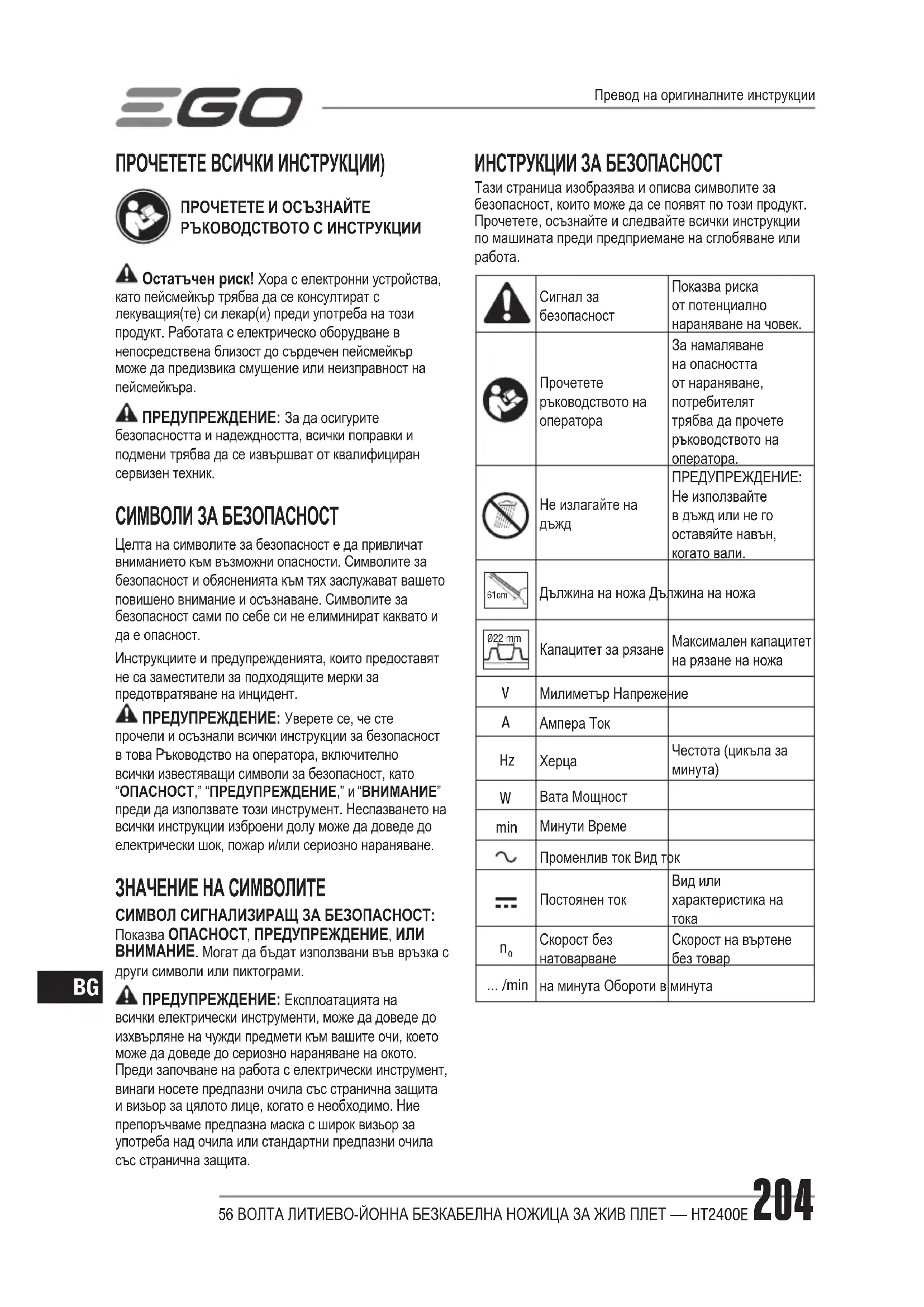 ◾ Дръжте електрическия инструмент само за изолираните повърхности за захващане, тъй като режещият нож може да влезе в контакт със скрит кабел. Режещите ножове в контакт с кабел под напрежение могат да направят откритите метални части под напрежение и могат да причинят на оператора токов удар. ◾ Дръжте кабелите далеч от зоната на рязане. Кабелът може да бъде скрит в храста по време на работа и да бъде срязан инцидентно от ножа. ◾ Проверете плета за чужди предмети преди работа, примерно телени огради. ◾ Използвайте само ножица за жив плет с монтиран по подходящ начин предпазител. Употребата на ножицата за жив плет без подходящ предпазител може да доведе до сериозно нараняване! ◾ Използвайте двете ръце, когато работите с ножицата за жив плет. Използването на една ръка може да причини загуба на контрол и да доведе до сериозно нараняване. ПРЕДУПРЕЖДЕНИЕ: Проверете живия плет за чужди предмети преди работа напр. телени огради. Използвайте ножицата за жив плет само с подходящо монтиран предпазител. Употребата на ножицата за жив плет без подходящ предпазител може да доведе до сериозно нараняване! ВАЖНИ ИНСТРУКЦИИ ЗА БЕЗОПАСНОСТ ◾ Не използвайте ножица за плет захранвана от батерия в дъжд. ◾ Не зареждайте акумулаторната батерия при дъжд или в мокра среда. ◾ Използвайте само с акумулаторни батерии и зарядни устройства изброени на фиг. A. ◾ Не хващайте откритите режещи ножове или режещи ръбове, когато повдигате и държите ножицата за плет. ◾ Не използвайте за опора стълба, покрив, дърво или друга нестабилна повърхност. Стабилната стойка на краката върху твърда повърхност позволява по-добро управление на ножицата за плет в непредвидени ситуации. ◾ Никога не позволявайте на деца да работят с ножицата за жив плет. ◾ Никога не премахвайте или поправяйте устройствата за безопасност. Проверявайте тяхната правилна работа редовно. Никога не правете нещо, което да пречи на функцията по предназначение на устройство за безопасност или да намали защитата, предоставена от устройство за безопасност. ◾ Никога не работете с ножица за жив плет без подходящите предпазители или други предпазни механизми за безопасност поставени на място. ◾ Проверете повредените части преди последваща употреба на ножицата за плет. Предпазителят или друга част, която е повредена трябва да бъде внимателно проверена за да се определи дали ще работи правилно и ще извърши предназначената функция. Проверете за разместване или блокиране на подвижни части, счупване на части, монтажа и всякакви други условия, които могат да окажат влияние на работата. Предпазител или други части, които са повредени трябва да бъдат правилно поправени или подменени от оторизиран сервизен център освен ако не е посочено друго в това ръководство. ◾ Проверявайте на чести интервали ножа и монтажните болтове на мотора за правилно затягане. Също визуално проверете ножа за повреди (примерно огъвания, пукнатини и износване). Подменете ножа само с нож от EGO