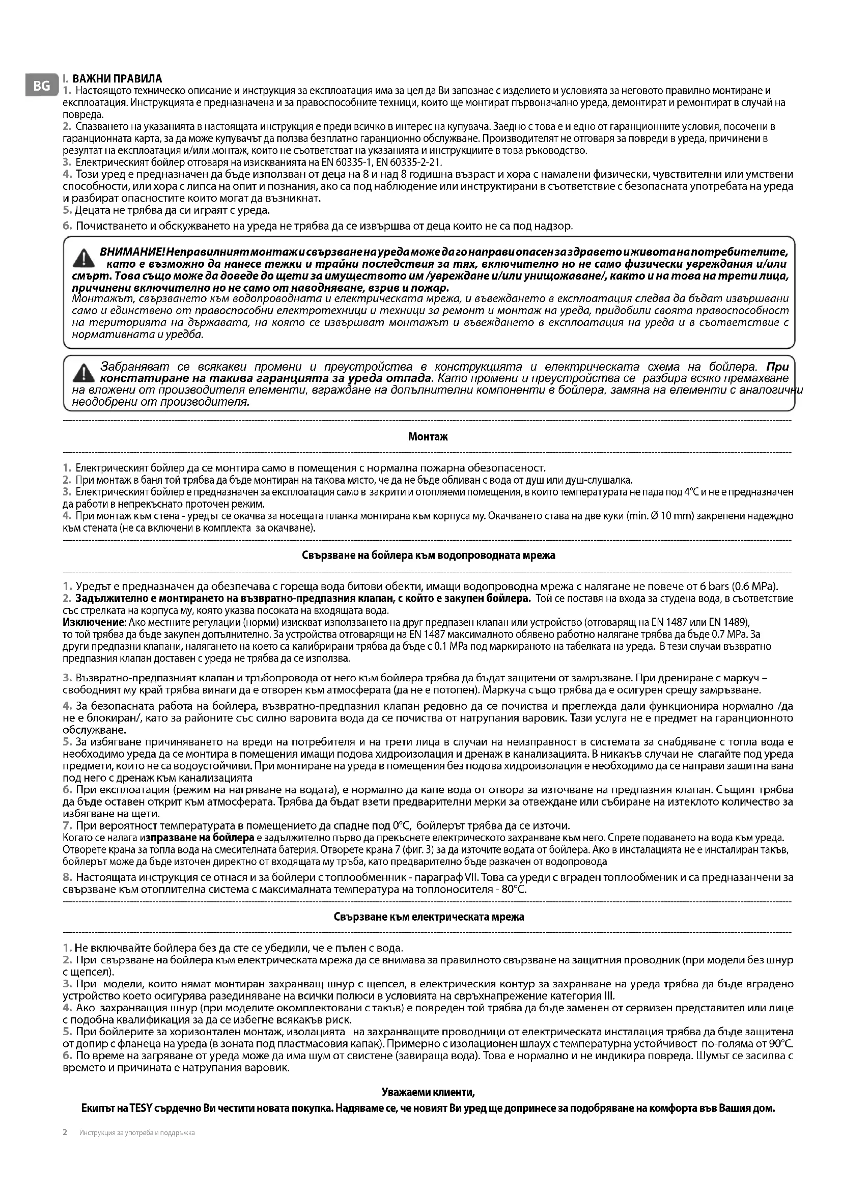 3. При модели, които нямат монтиран захранващ шнур с щепсел, в електрическия контур за захранване на уреда трябва да бъде вградено устройство което осигурява разединяване на всички полюси в условията на свръхнапрежение категория III. 4. Ако захранващия шнур (при моделите окомплектовани с такъв) е повреден той трябва да бъде заменен от сервизен представител или лице с подобна квалификация за да се избегне всякакъв риск. 5. При бойлерите за хоризонтален монтаж, изолацията на захранващите проводници от електрическата инсталация трябва да бъдe защитенa от допир с фланеца на уреда (в зоната под пластмасовия капак). Примерно с изолационен шлаух с температурна устойчивост по-голяма от 90°C. 6. По време на загряване от уреда може да има шум от свистене (завираща вода). Това е нормално и не индикира повреда. Шумът се засилва с времето и причината е натрупания варовик. Уважаеми клиенти, Екипът на TESY сърдечно Ви честити новата покупка. Надяваме се, че новият Ви уред ще допринесе за подобряване на комфорта във Вашия дом.Инструкция за употреба и поддръжка 3