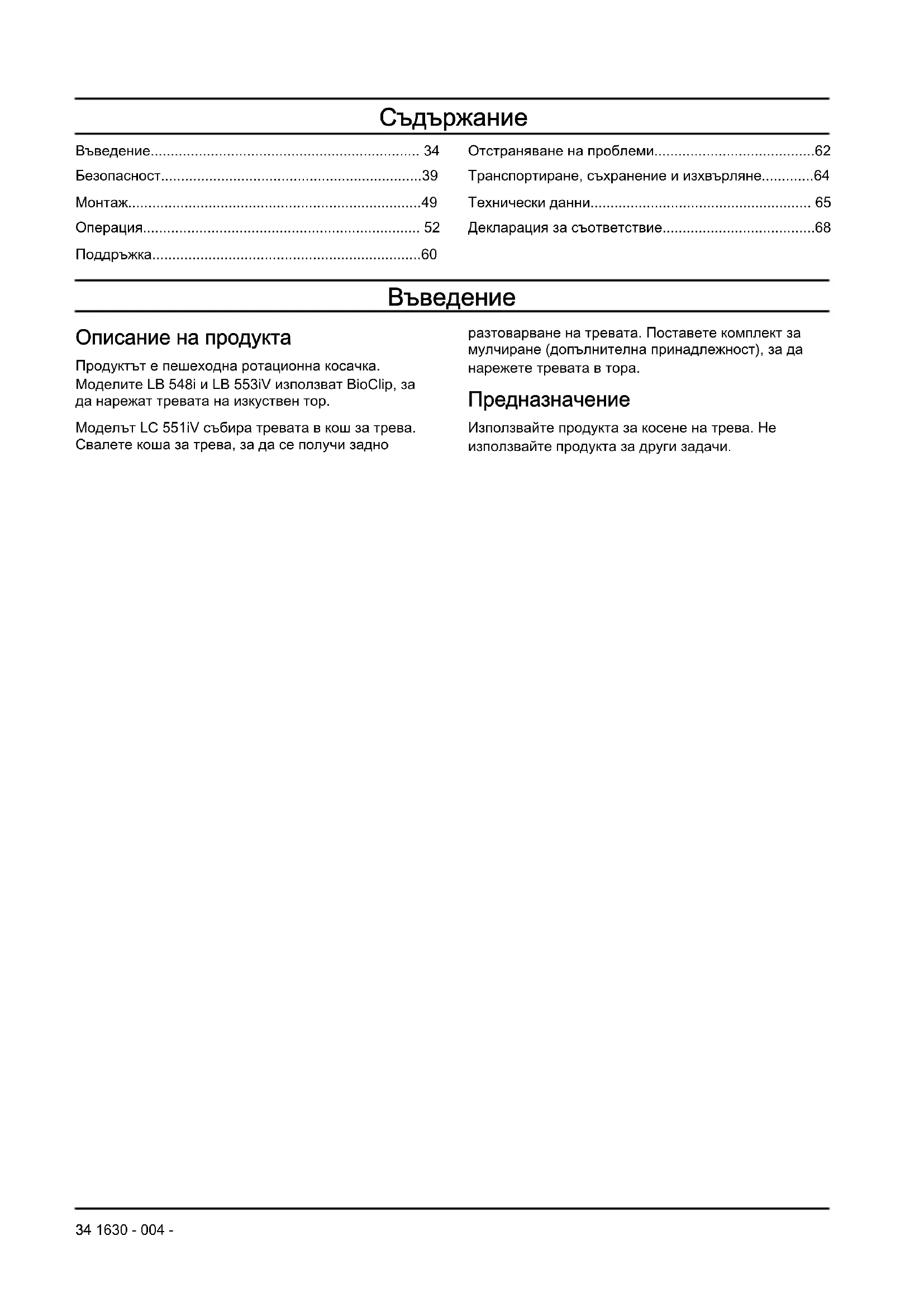 Описание на продукта Продуктът е пешеходна ротационна косачка. Моделите LB 548i и LB553iV използват BioClip, за да нарежат тревата на изкуствен тор. Моделът LC551iV събира тревата в кош за трева. Свалете коша за трева, за да се получи задно разтоварване на тревата. Поставете комплект за мулчиране (допълнителна принадлежност), за да нарежете тревата в тора. Предназначение Използвайте продукта за косене на трева. Не използвайте продукта за други задачи. 34 1630 - 004 -Общ преглед на продукта (LB548i, LC551iV) LB 548i LC 551iV