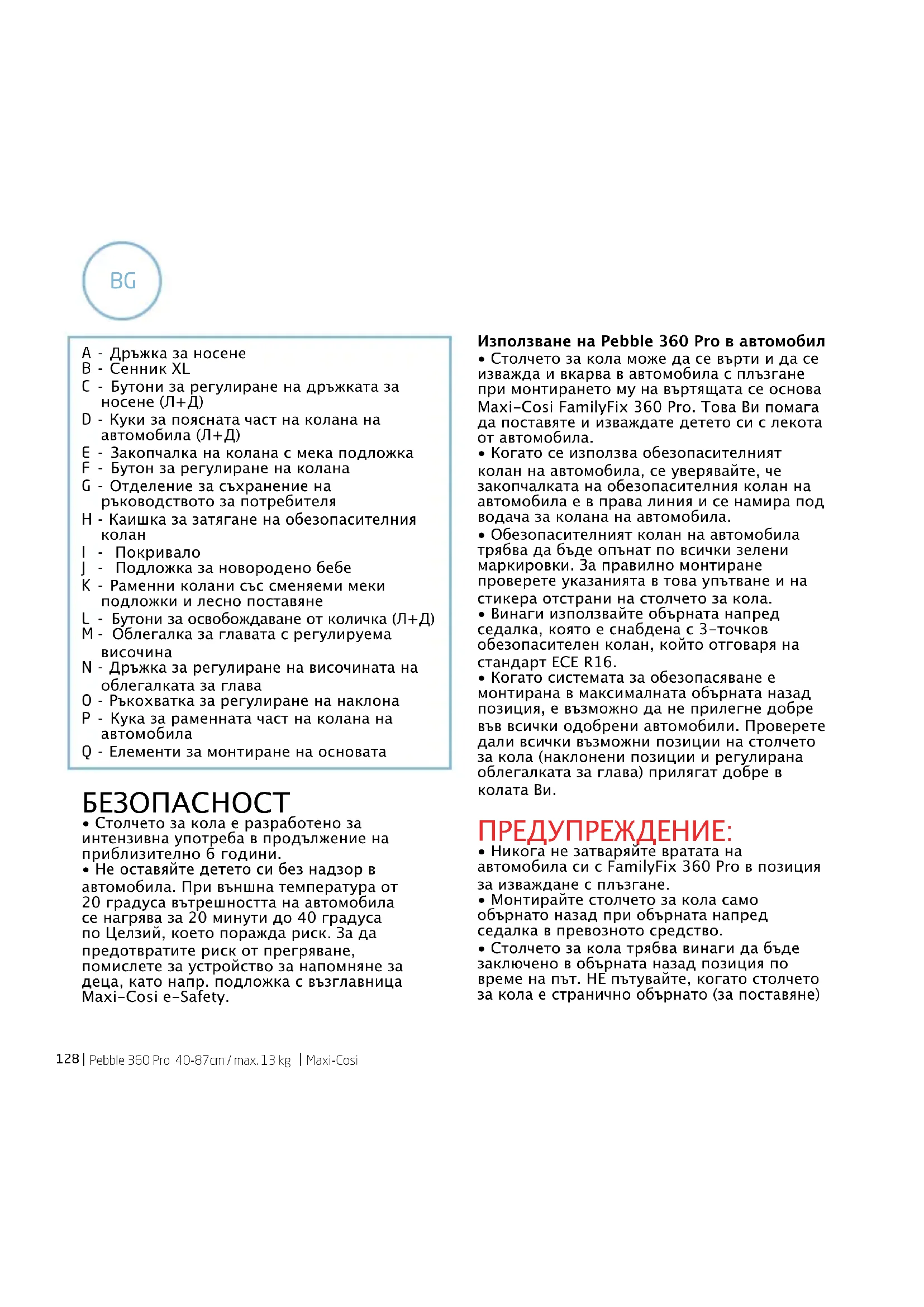- Не оставяйте детето си без надзор в автомобила. При външна температура от 20 градуса вътрешността на автомобила се нагрява за 20 минути до 40 градуса по Целзий, което поражда риск. За да предотвратите риск от прегряване, помислете за устройство за напомняне за деца, като напр. подложка с възглавница Maxi-Cosi e-Safety. Използване на Pebble 360 Pro в автомобил