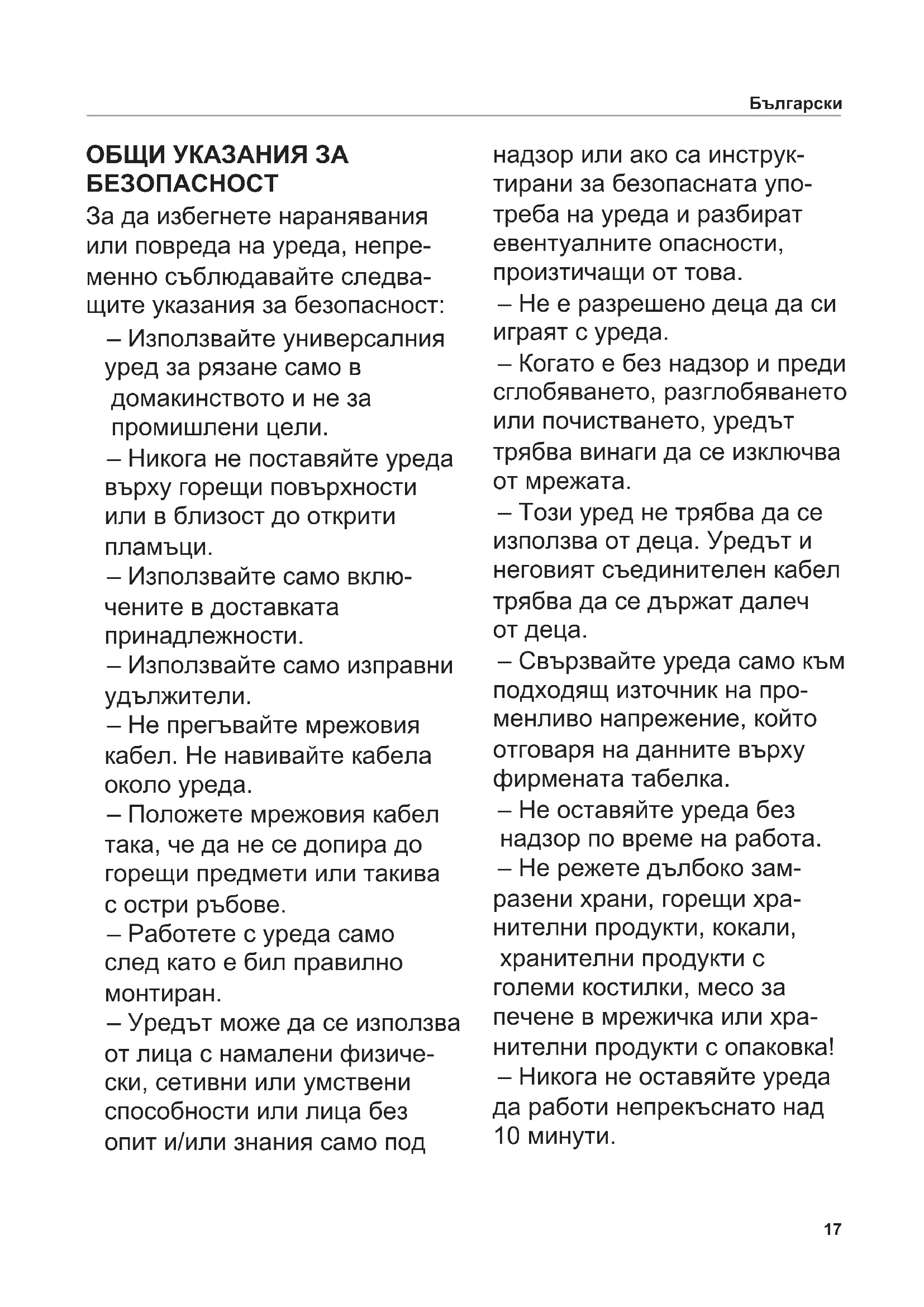 ОБЩИ УКАЗАНИЯ ЗА БЕЗОПАСНОСТ За да избегнете наранявания или повреда на уреда, непре- менно съблюдавайте следва- щите указания за безопасност: – Използвайте универсалния уред за рязане само в домакинството и не за промишлени цели. – Никога не поставяйте уреда върху горещи повърхности или в близост до открити