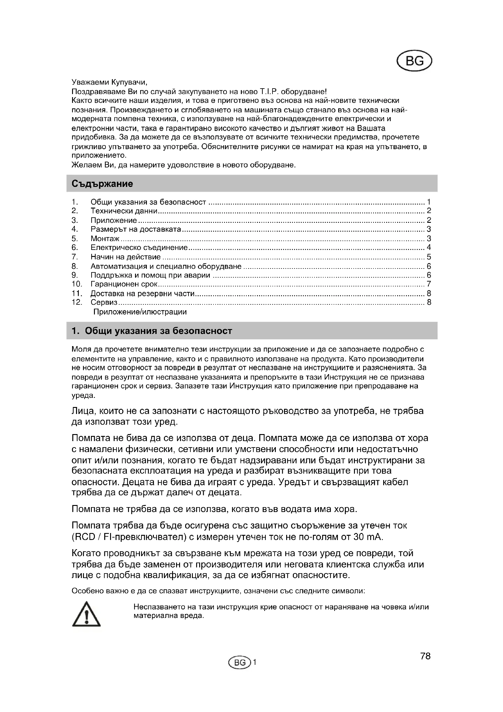 Уважаеми Купувачи, Поздравяваме Ви по случай закупуването на ново T.I.P. оборудване! Както всичките наши изделия, и това е приготвено въз основа на най-новите технически познания. Произвеждането и сглобяването на машината също станало въз основа на най- модерната помпена техника, с използуване на най-благонадеждените електрически и електронни части, така е гарантирано високото качество и дългият живот на Вашата придобивка. За да можете да се възползувате от всичките технически предимства, прочетете грижливо упътването за употреба. Обяснителните рисунки се намират на края на упътването, в приложението. Желаем Ви, да намерите удоволствие в новото оборудване.